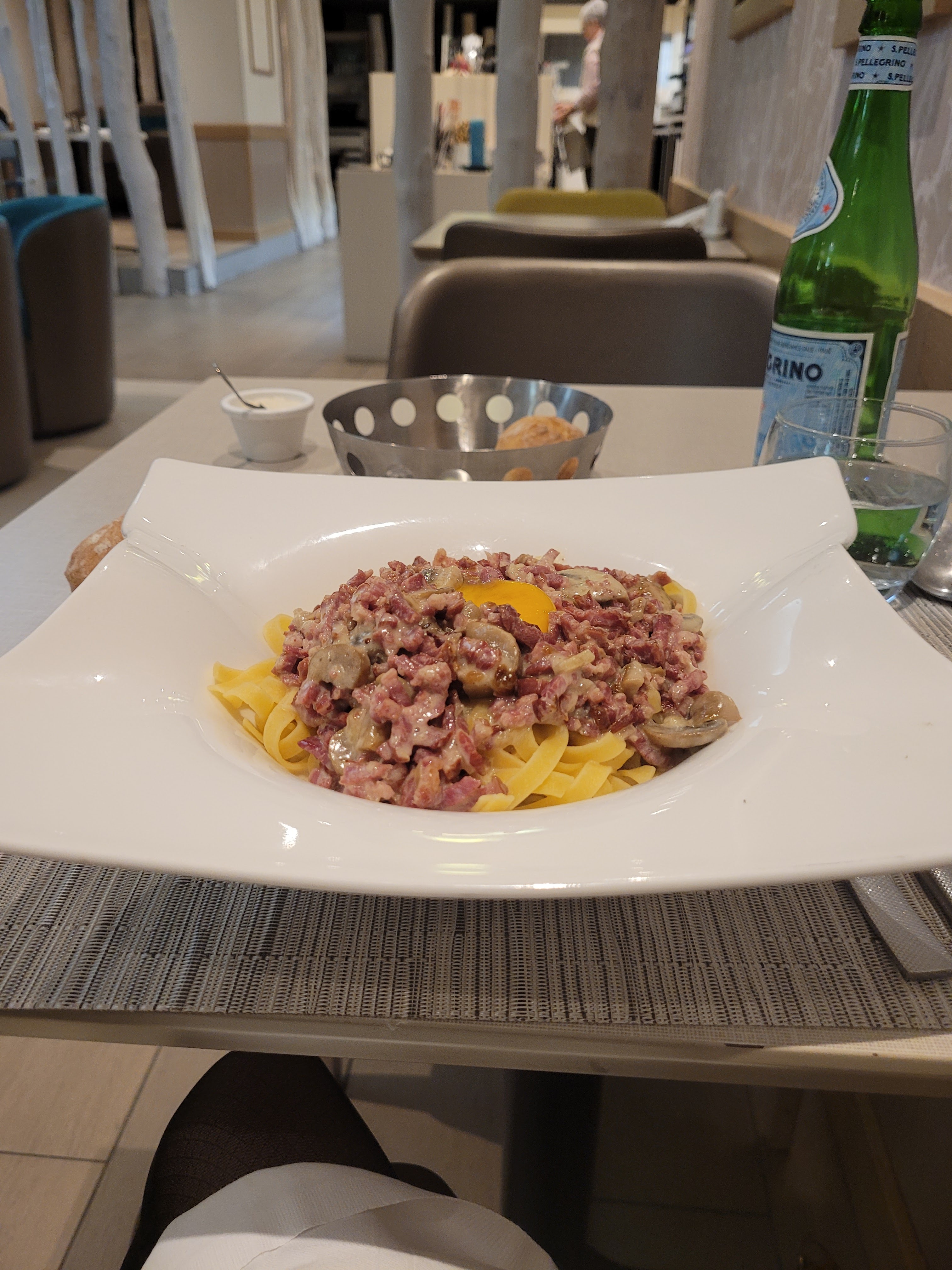 Très bon accueil dès notre arrivée. Déçu des pâtes carbonara qui, en plus de baigner dans la sauce, n'étaient pas très appétissantes. La salade en entrée était très fraîche. Le crumble à la mangue était excellent... Mais ça n'avait rien d'un crumble... Le rapport qualité prix est un peu cher.