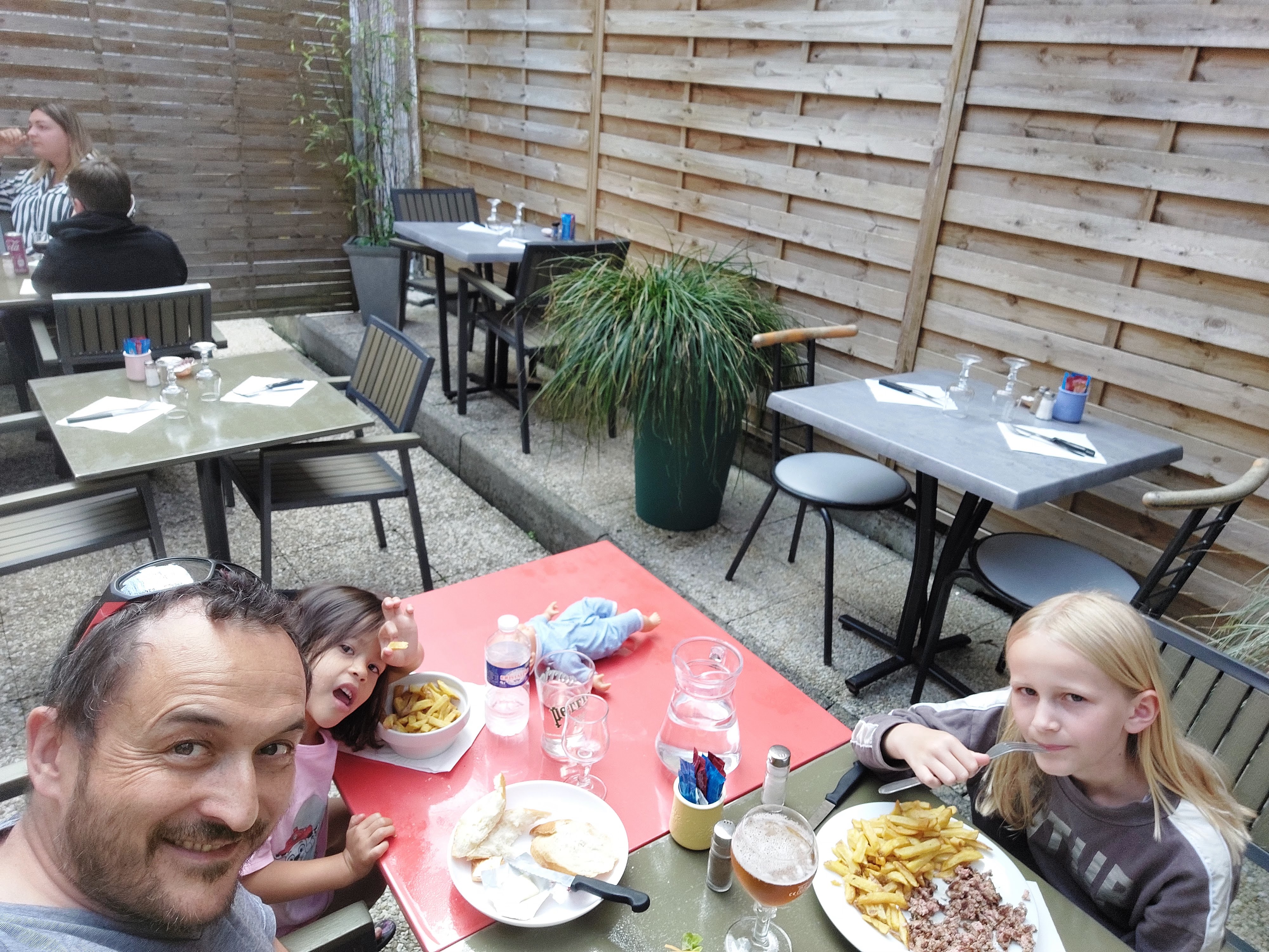 Ambiance détendue, déjeuner en terrasse au soleil légèrement voilé par un store, cuisine snack mais bonne (hummm, les 🍟 maison !!!)