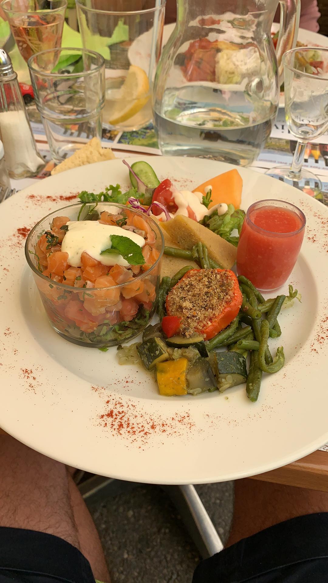Une cuisine maison de qualité pour un prix très raisonnable. Le gaspaccio de tomates était parfaitement relevé, l'aubergine farcie au bœuf un délice et la tarte aux pommes figues servie chaude termine agréablement ce déjeuner. Bravo.