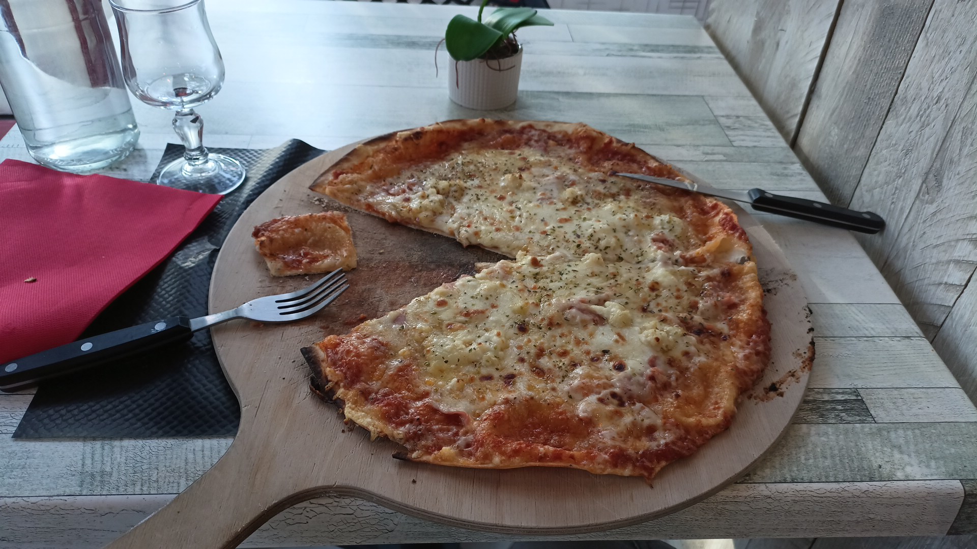 Bonne pizza malgré un manque de sauce tomate . Service impeccable .bon rapport qualité prix. Joli cadre .