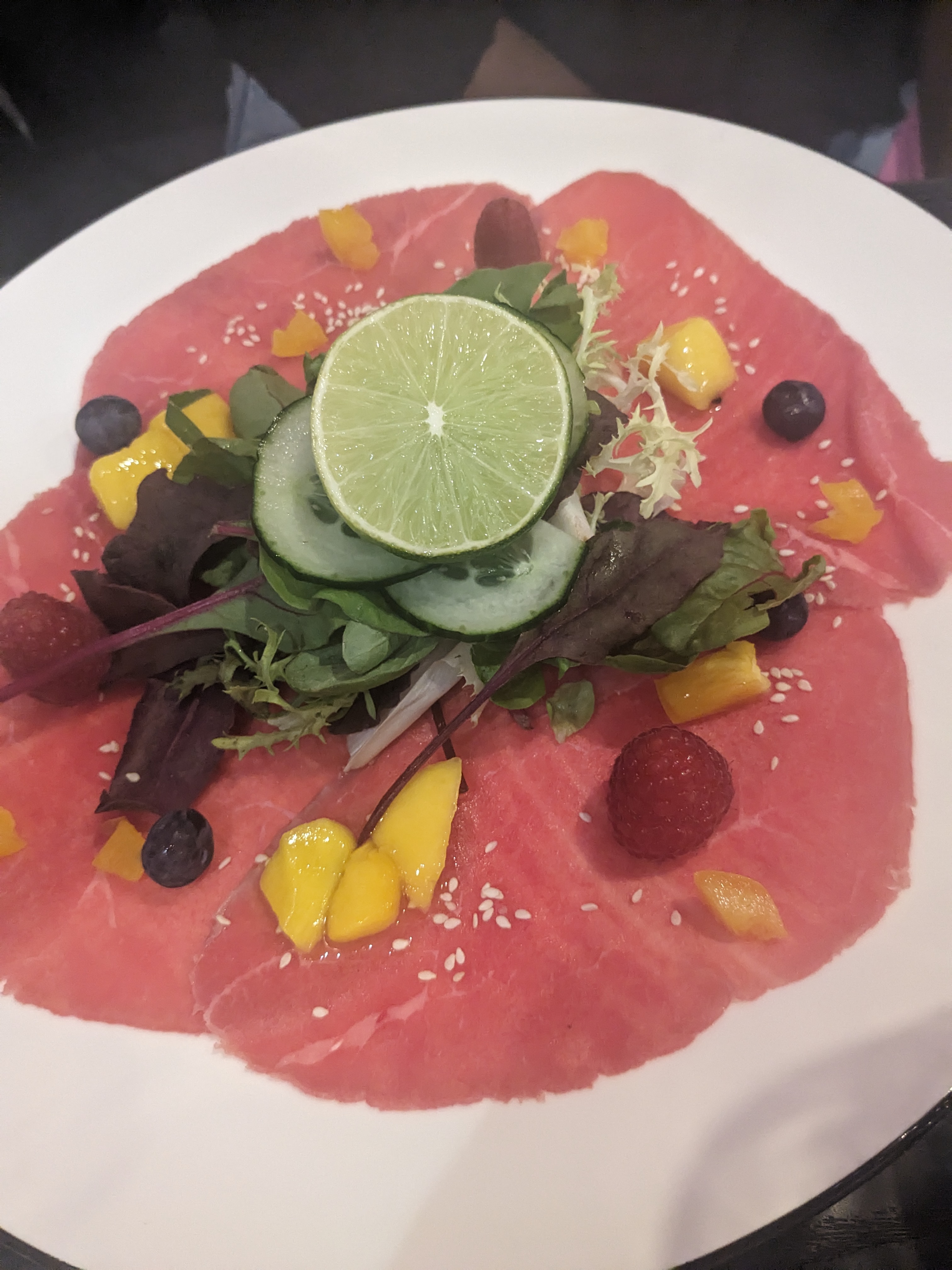 Très belle découverte. Première fois que je goûte le Carpaccio au thon et carpaccio Espadon et qui plus est avec des fruits. J'ai aimé le fait qu'on rajoute nous même le sel, citron, huile... et qu'on ai le choix des accompagnements. Le pain était servi chaud et croquant, le burrata était excellent et les boules de glaces (surtout le chocolat et la vanille ) ... un pur régale. En plus le patron est super sympa. Ma mère et moi on a vraiment apprécié. Merci