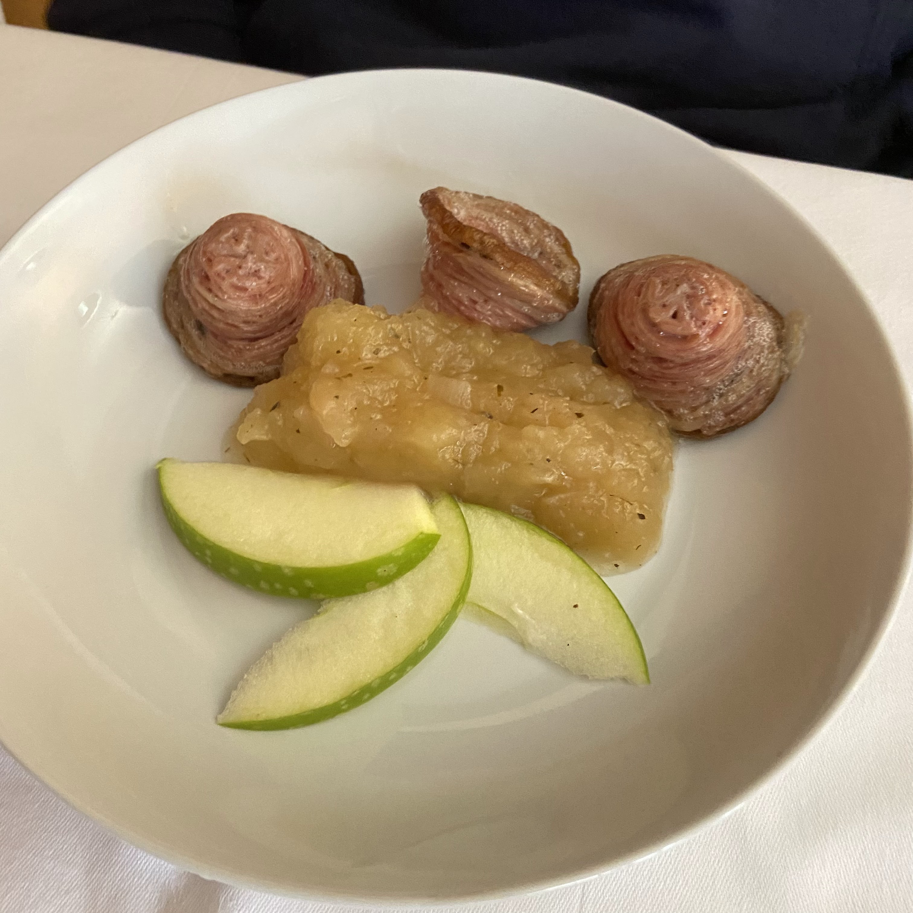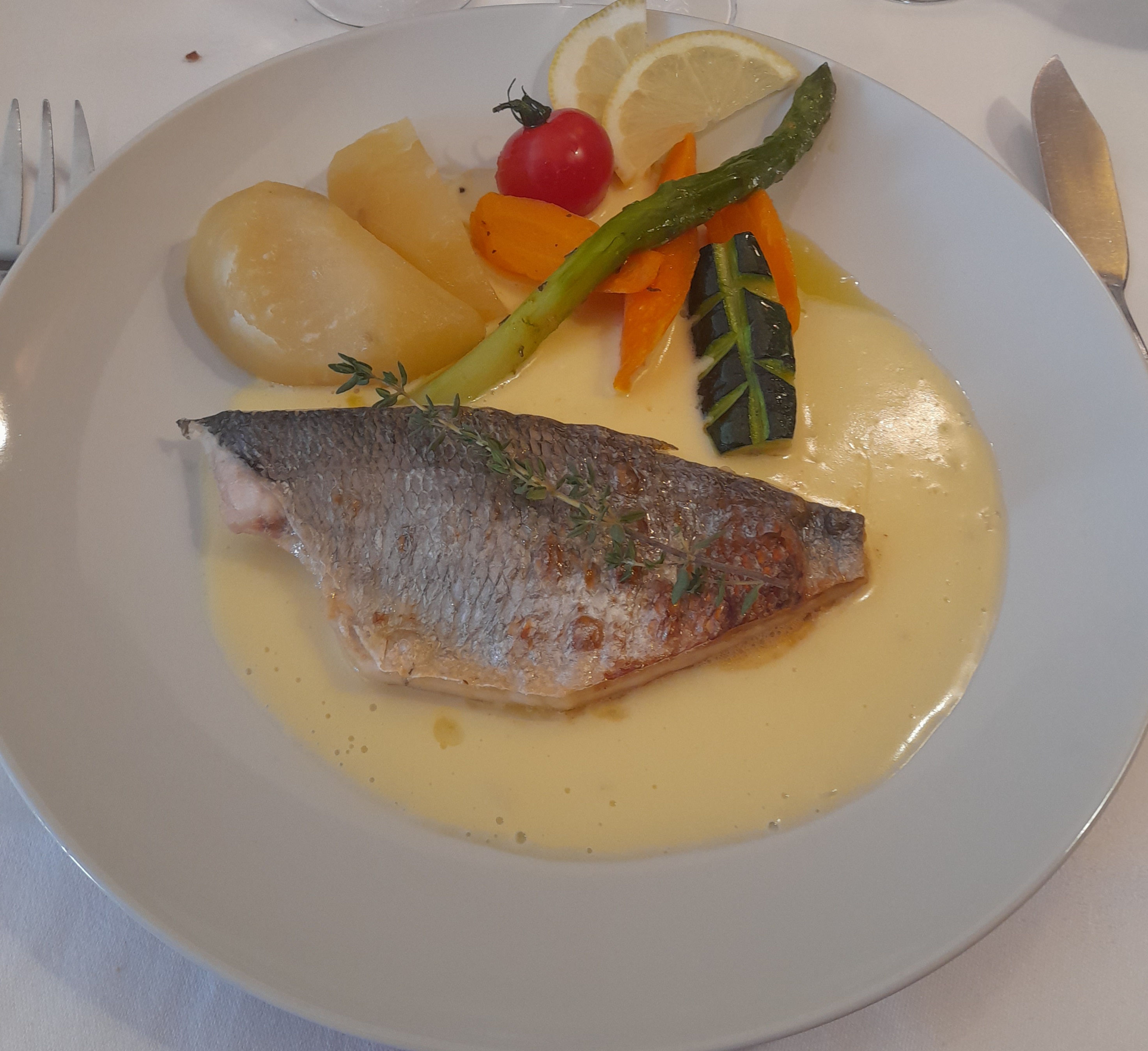 Daurade au beurre blanc :c'est plutôt une sauce blanche un peu fade... Dommage. Repas peu copieux.