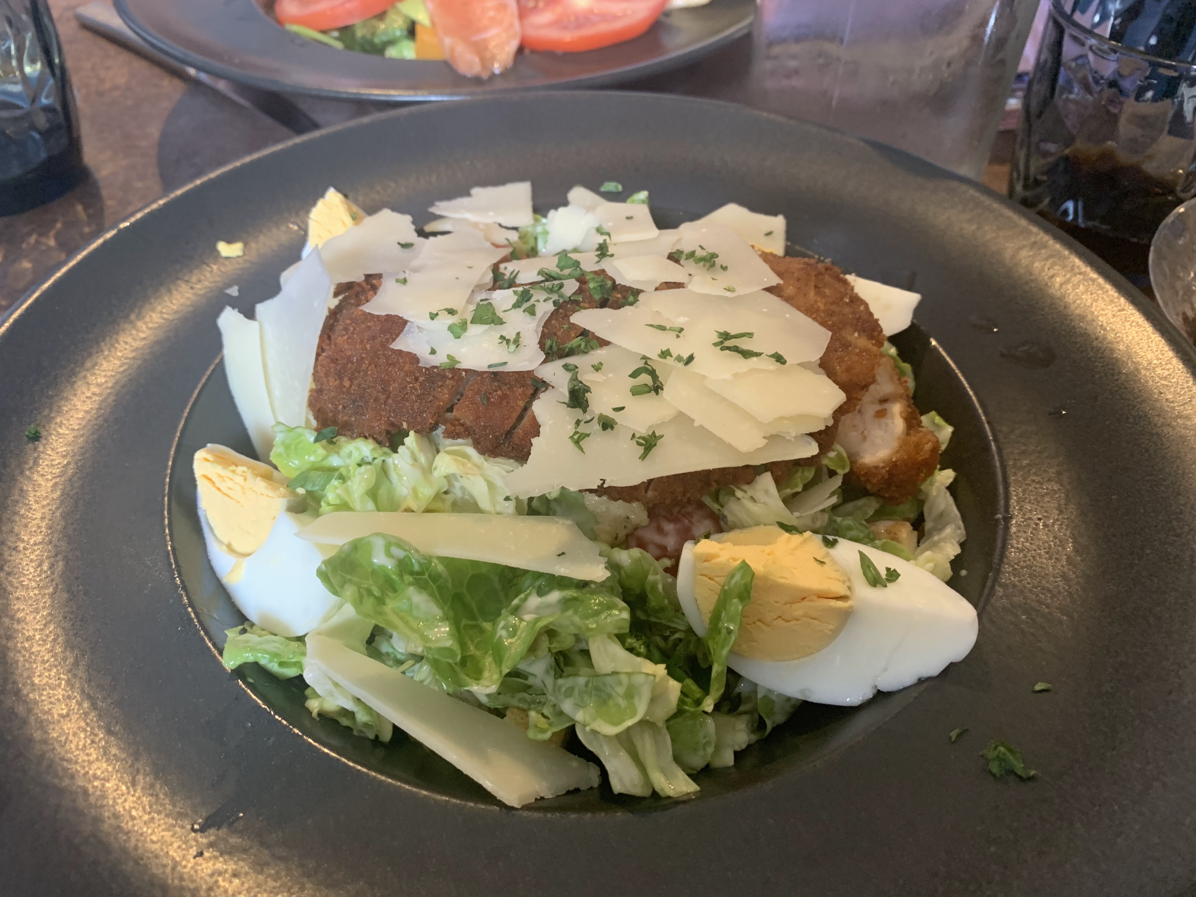 Vraiment déçue de l’aubergine en salade. Juste des tomates, mozza, aubergine qui manquait cruellement de goût et d’assaisonnement. Le petit verre de vin blanc italien et l’Amaretto offert ont un peu rattrapé.