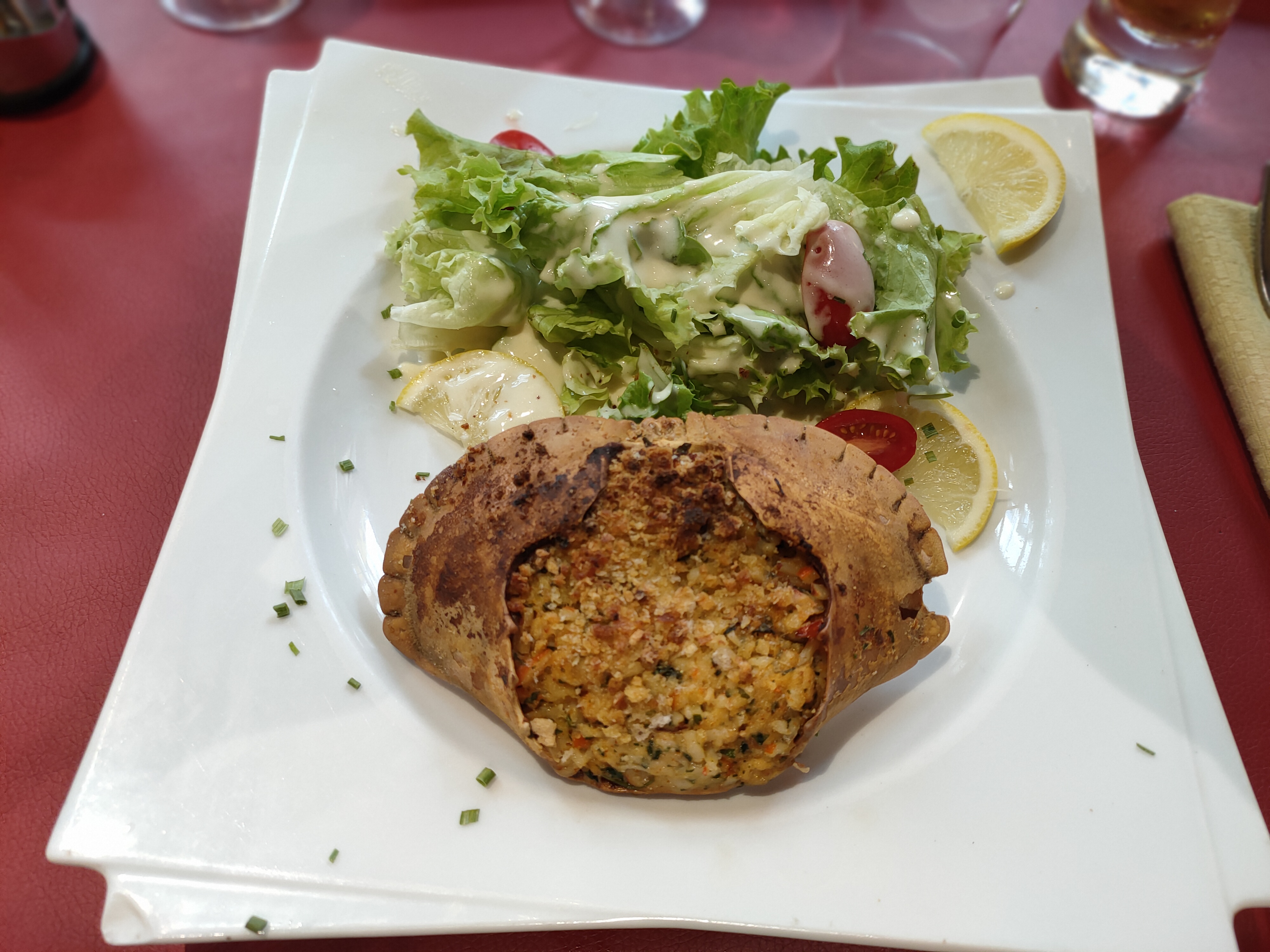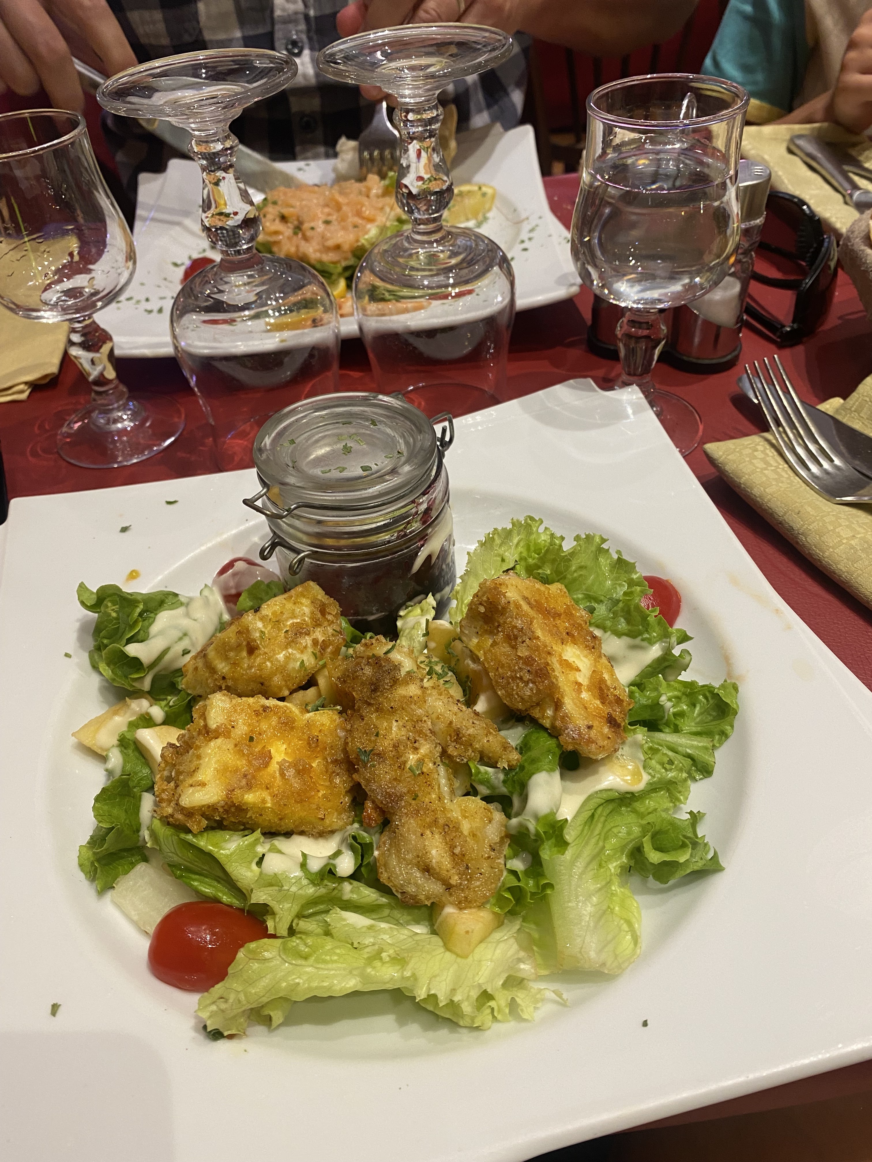 Nous avons commandé une salade de chèvre chaud et un plateau de fruits de mer. La salade était peu copieuse mais la panure du fromage est faite maison. Le plateau de fruits de mer était tout à fait convenable, rien ne manquait, et le rapport quantité prix bien plus intéressant que dans les restaurants près de l'eau. Le service a été plutôt convenable dans l'ensemble, seule la carte des vins mériterait d'être plus étayée.