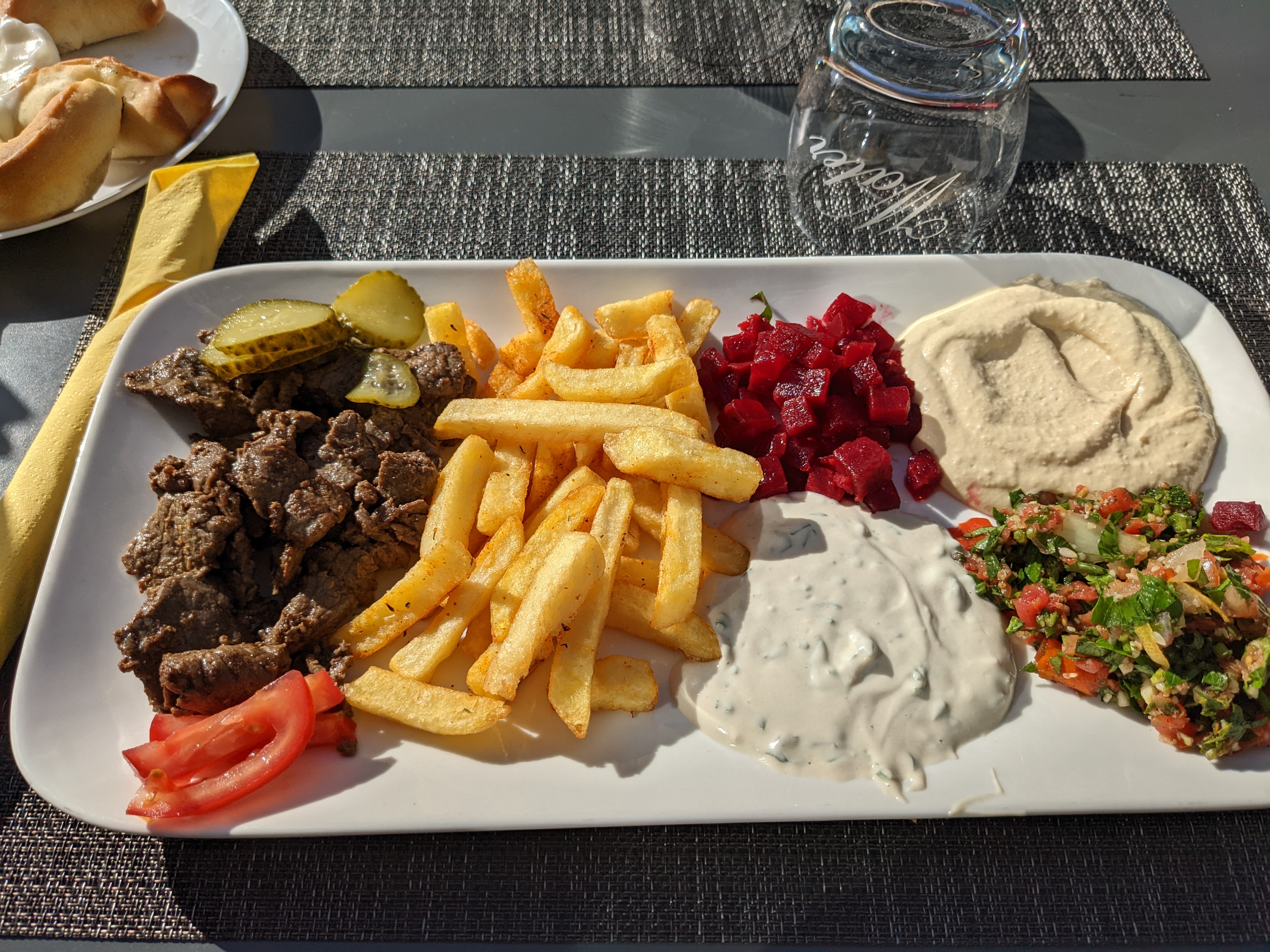 Propriétaire fort sympathique, Les plats sont très bon, dommage que le pain pour accompagner le humus et la crème à l'ail sont des galettes à tortillas sans goût.. À revoir cela