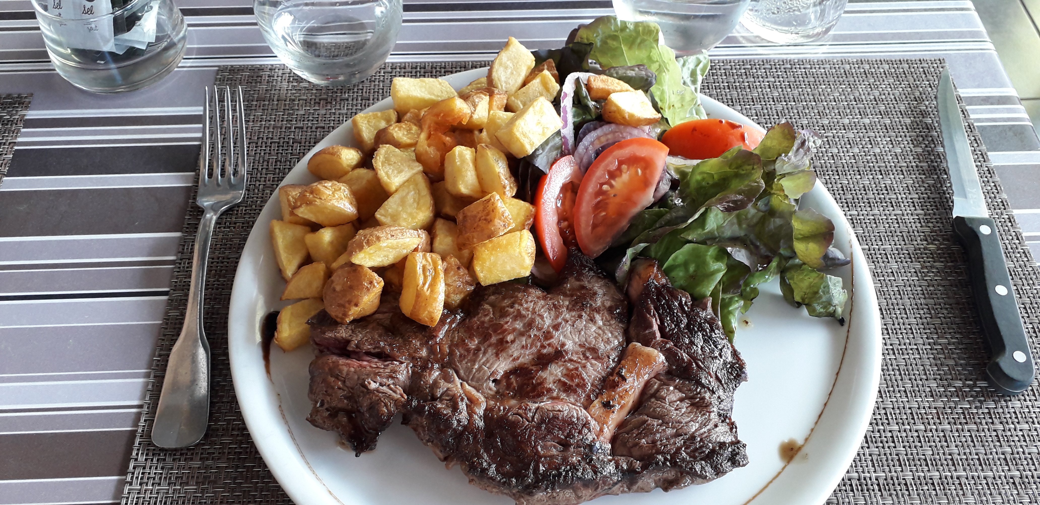 L'entrecôte de boeuf très bonne avec des frites fraîches.... Tres bon service.... Les prix très correctes.... Et face au couché de soleil