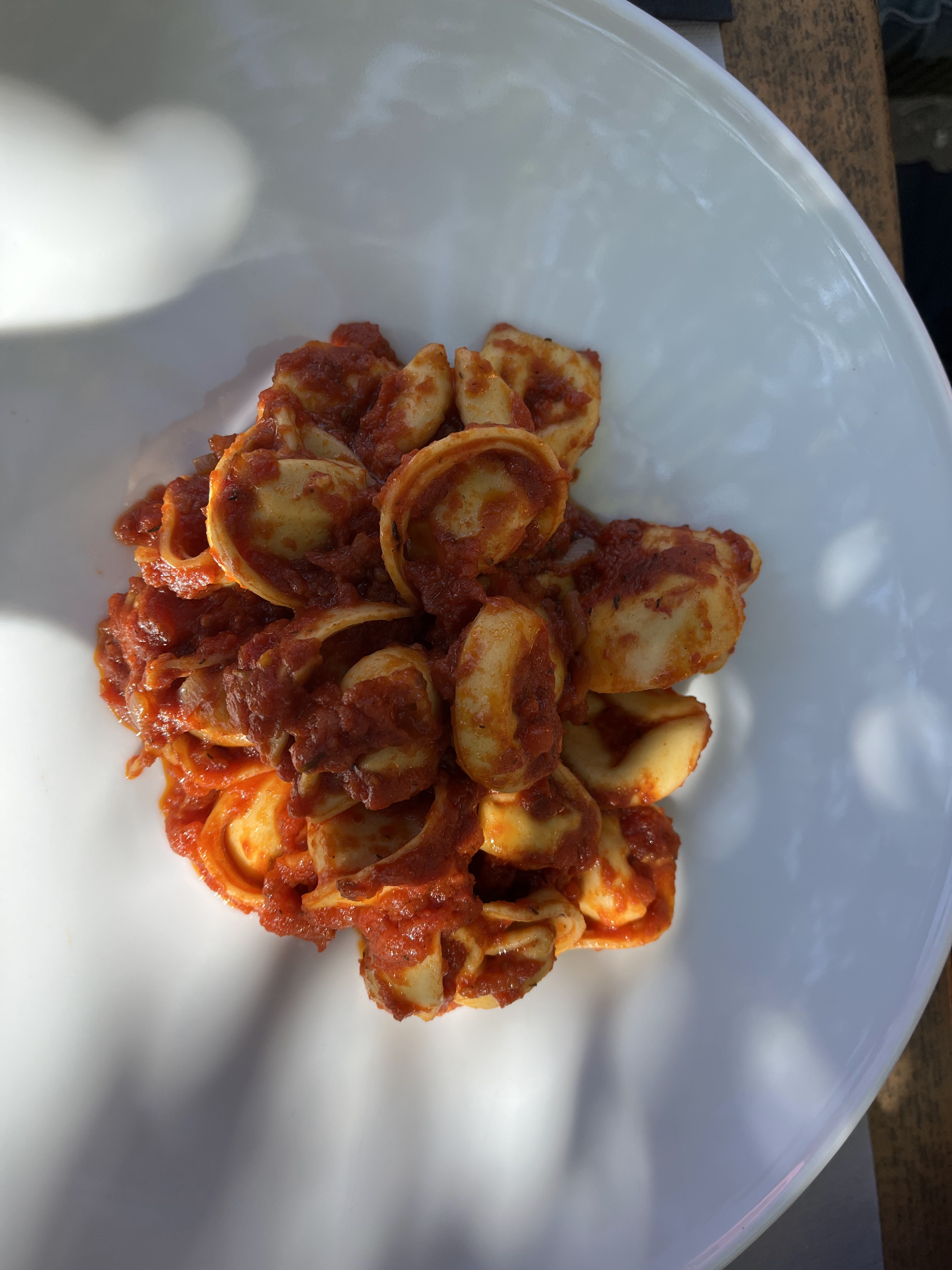 Nous nous sommes arrêtés au panneau crêpes pour nos enfants. Ils ne font plus de crêpes mais nous avons eu un déjeuner fantastique dans le charmant jardin à l'arrière. Nous ne parlons pratiquement pas français, la fille a fait de son mieux pour tout nous faire comprendre. Tagliolini de cochon au miel, tortellini aux tomates et surtout les gâteaux !!!