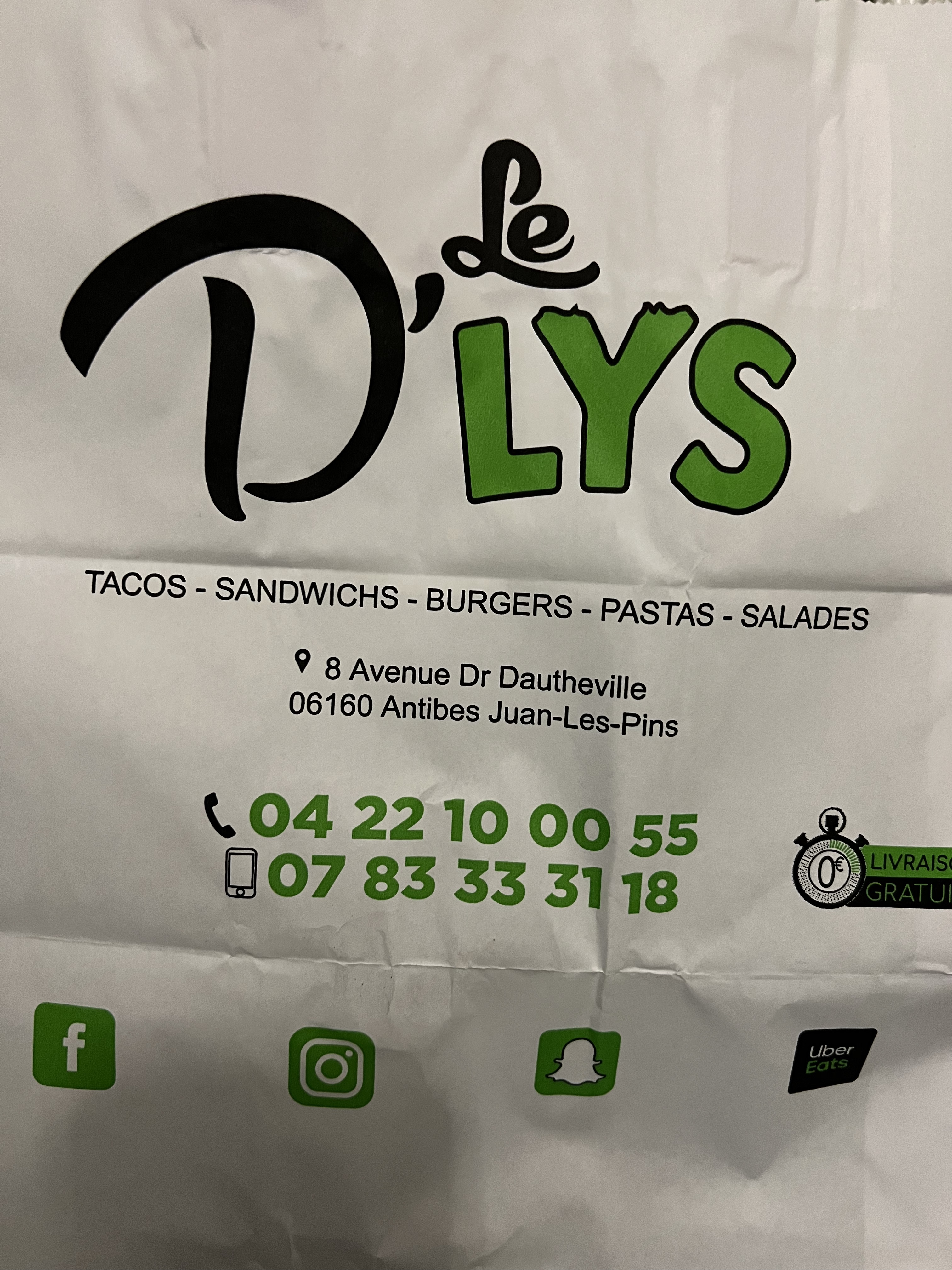Si vous êtes de passages à Juan les pins passez par le D'lys incroyablement bon Tacos surtout lharissa maison une tuerie ,tres accueillant. Seul point négatif ferme trop tôt (23h) 00h serait plus approprier. pour les touristes pas top quand ont faient le déplacement de Cannes.