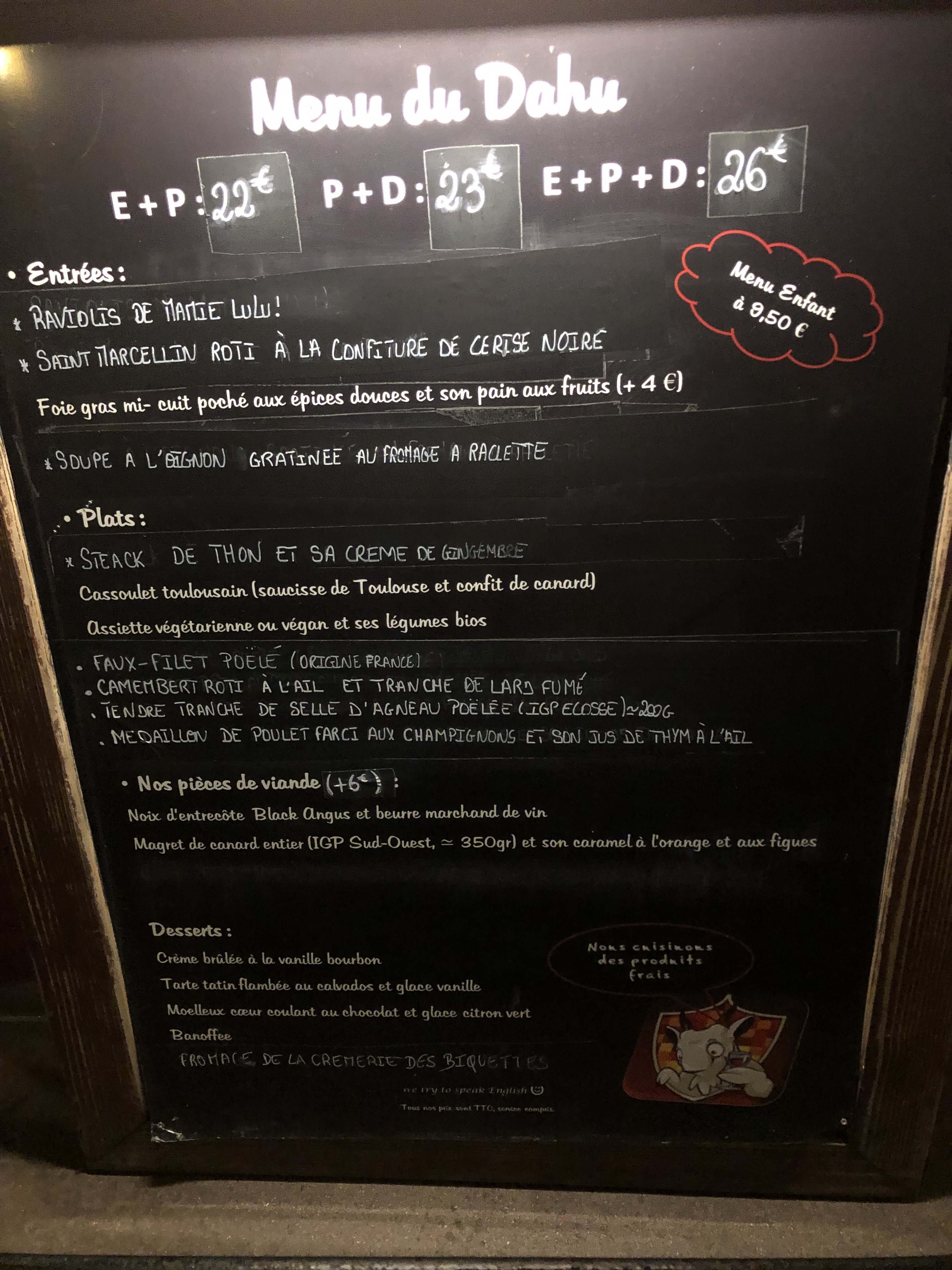 Belle expérience chez Le Dahu : très bon cassoulet et assiette végétarienne. Bon accueil et ambiance du dimanche détendue. On recommande !