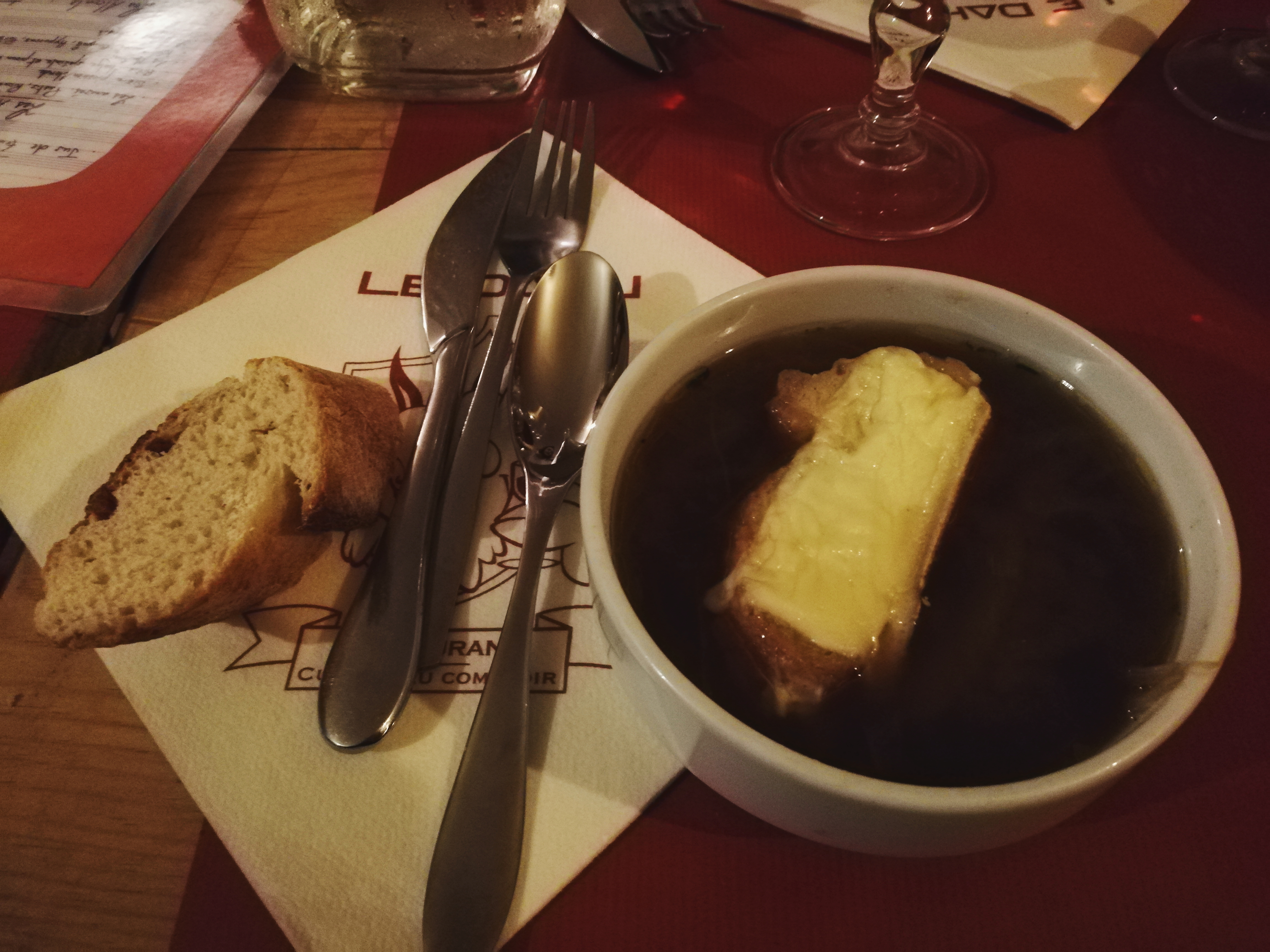 La soupe à l'oignon hyper saléeeeeee!!! Encore pire que le miso japonais. Le veau est moyen, et j'ai goûté le magret canard de mon ami, franchement c'est moyen aussi. Mais l'environnement du sous-sol est agréable pour notre dîner de noël.