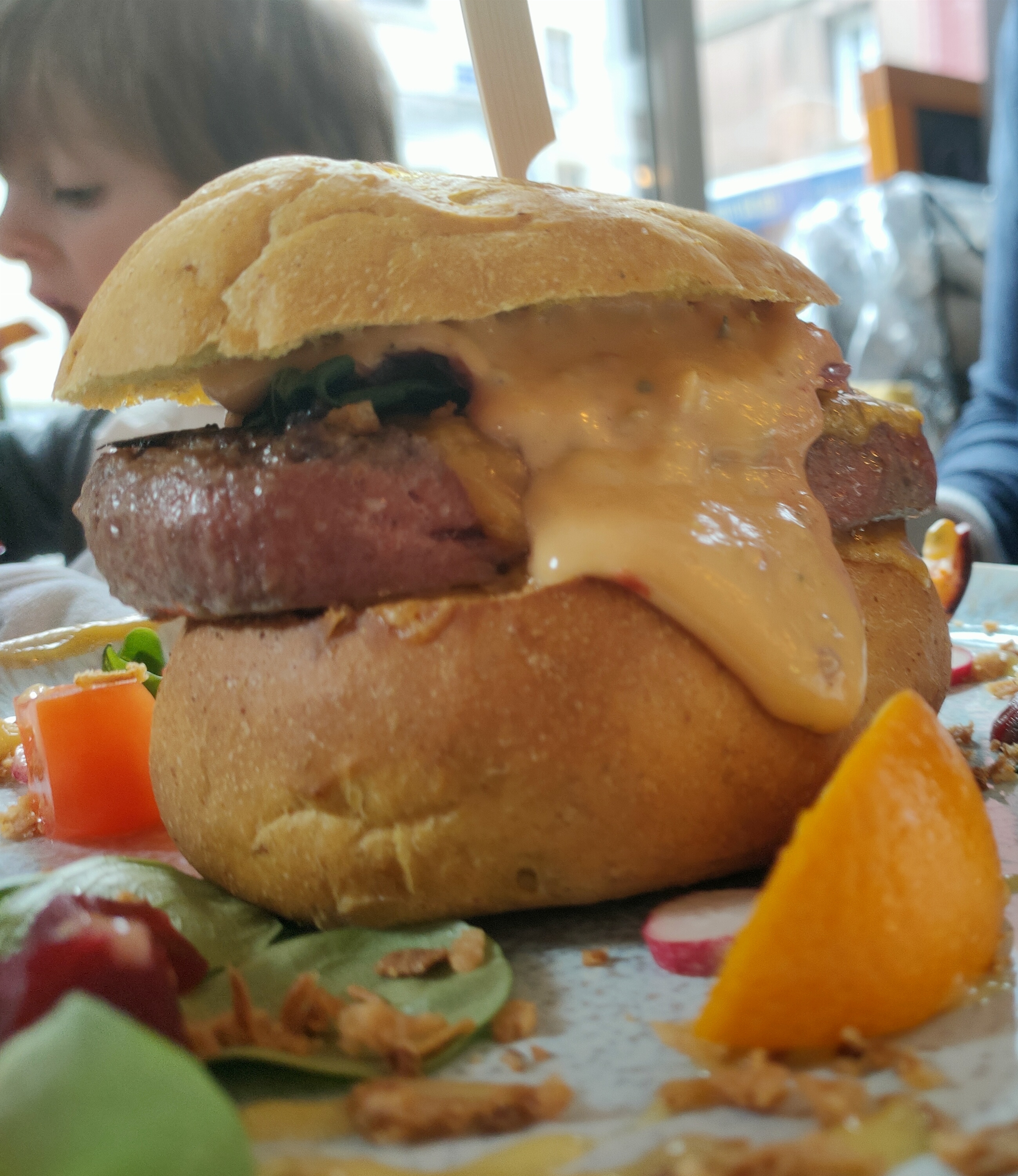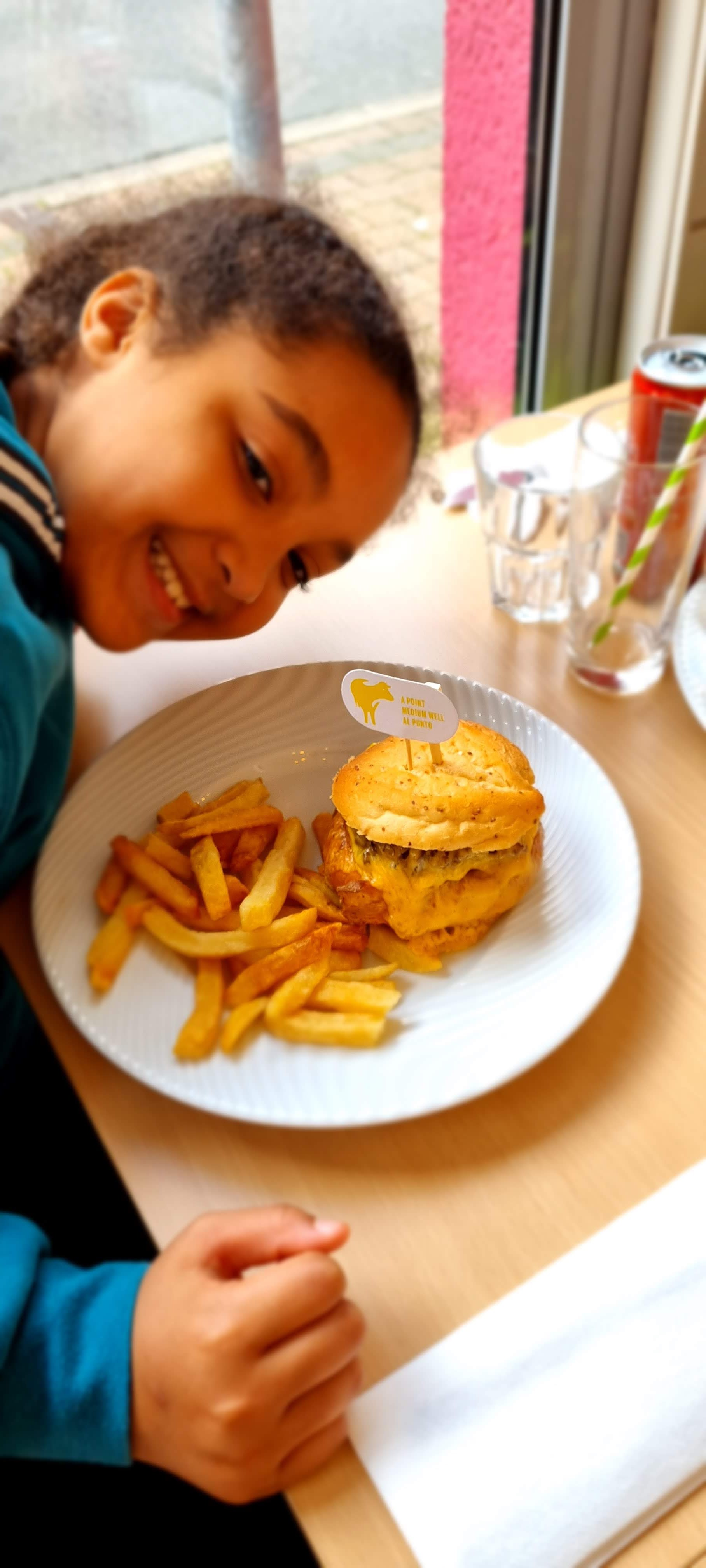 Restaurant dans rue peu passante Superbe découverte, burgers et salades délicieux et originaux Menu enfant : version miniature des plats, ce qui leur permet de déguster comme papa, maman