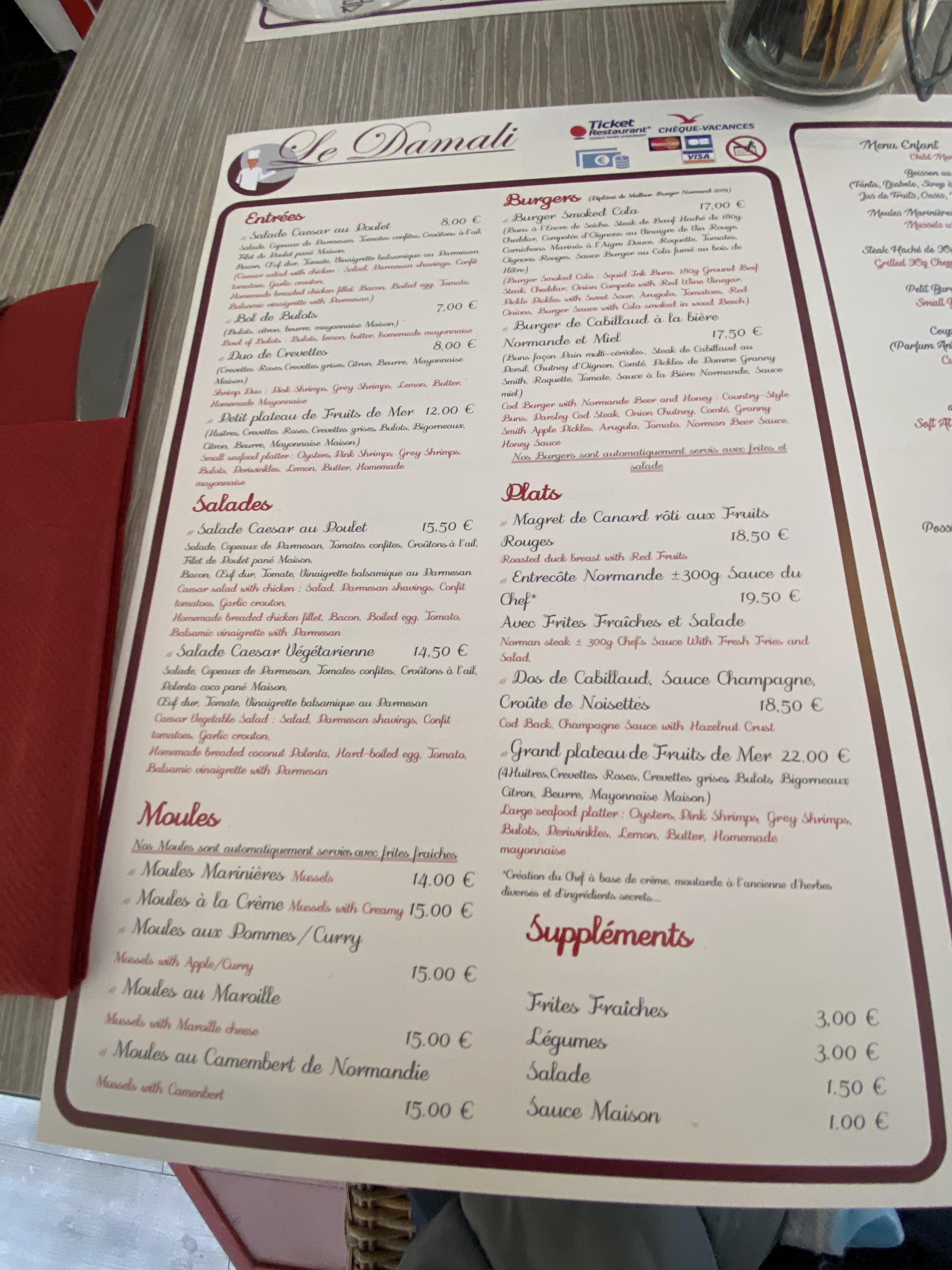 Visite au Tréport, nous cherchions à manger un burger Frites et nous sommes tombés sur le champion du meilleur Burger 3 années de suite, accueil agréable, burger sucré sale comme on les aime, (camembert chutney pommes et foie gras chutney figues oignons rouges).belle présentation, un régal pour les yeux et les papilles. Tarifs, il faut compter 17euros / 18euros le plat et 6 euros un dessert maison. Je recommande.