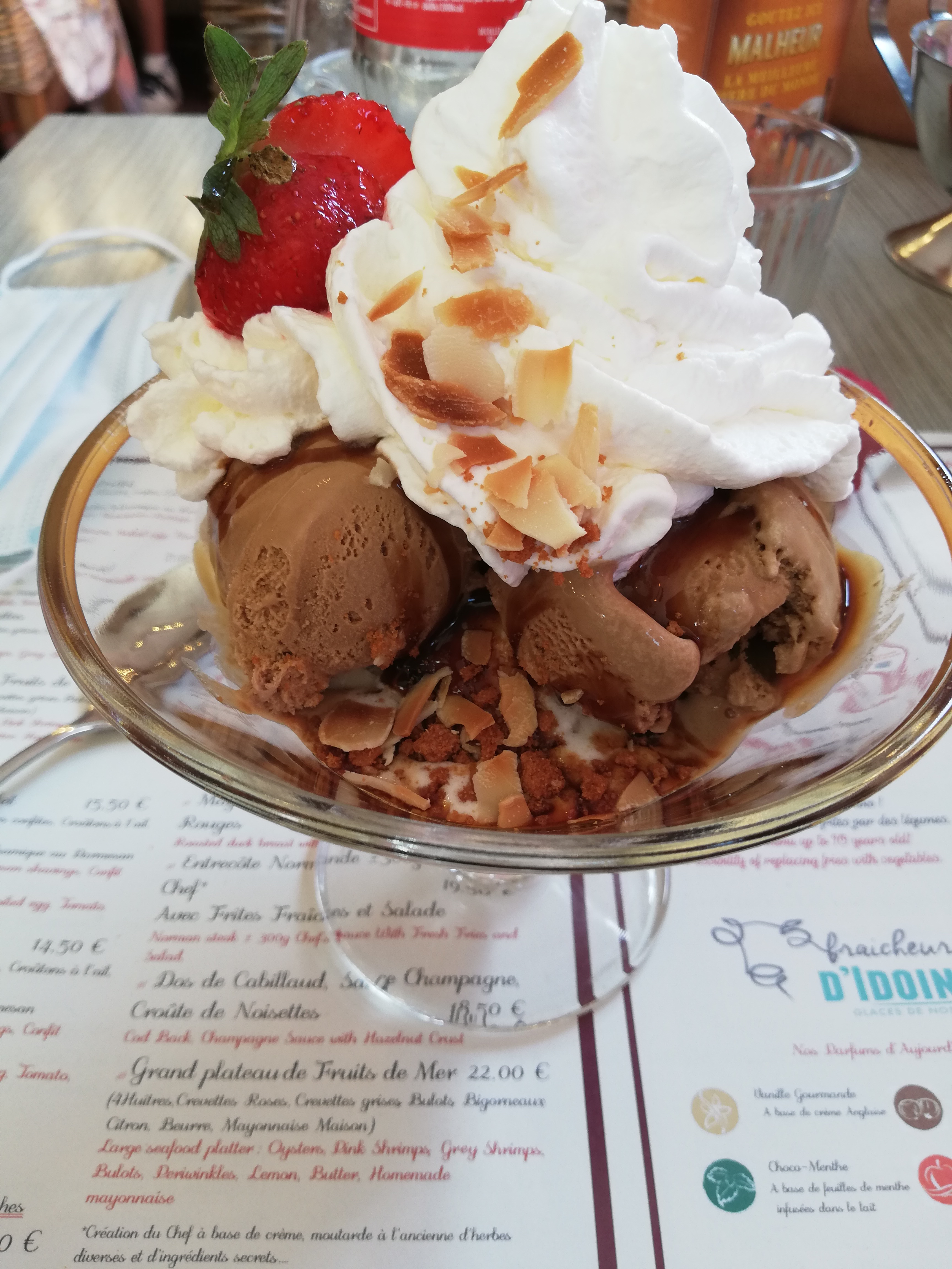 J’avais repéré le restaurant sur les réseaux. En passant devant je me suis aperçu qu’il fallait effectivement réserver Dès mon arrivée ce matin vers 10:00 pour réserver donc, l’accueil est au rendez-vous, sourires, disponibilité tout se présente pour le mieux. Arrivés pile à l’heure notre table nous attend et les cartes nous sont rapidement proposées. Nous choisissons le menu à 30€ (entrée, plat, dessert) Entrées: Duo de crevettes et maquereaux marinés Plats: Moules et pièces du boucher Dessert: Duo de glace (vanille et café), crème brûlée Tout est impeccable. Produits extra frais, entièrement fait maison (pain et glaces également) Le maquereau se distingue par sa finesse et sa fraîcheur et il est généreusement servi, un régal. Une palme pour les crevettes grises et les nombreux bulots Les moules sont bonnes avec un bouillon bien corsé La viande est généreuse avec une sauce aux poivres savoureuse Les frites pour les 2 plats sont croustillantes et fondantes à cœur La crème brûlée aux amandes est juste parfaite La glace est à l’image du repas marquée en goût et façonnée « maison » A la fin du service, le patron prend le temps de nous décrire son travail, l’investissement de l’équipe et sa passion de la cuisine à l’image de sa description de la confection de sa glace au café et de sa dernière née la glace à la barbe à papa qu’il nous offre en dégustation: Très douce avec une très légère note de fraise, une bonté En somme, une adresse que je vous recommande vivement si vous êtes dans la région. Vraiment n’hésitez pas, on y est bien