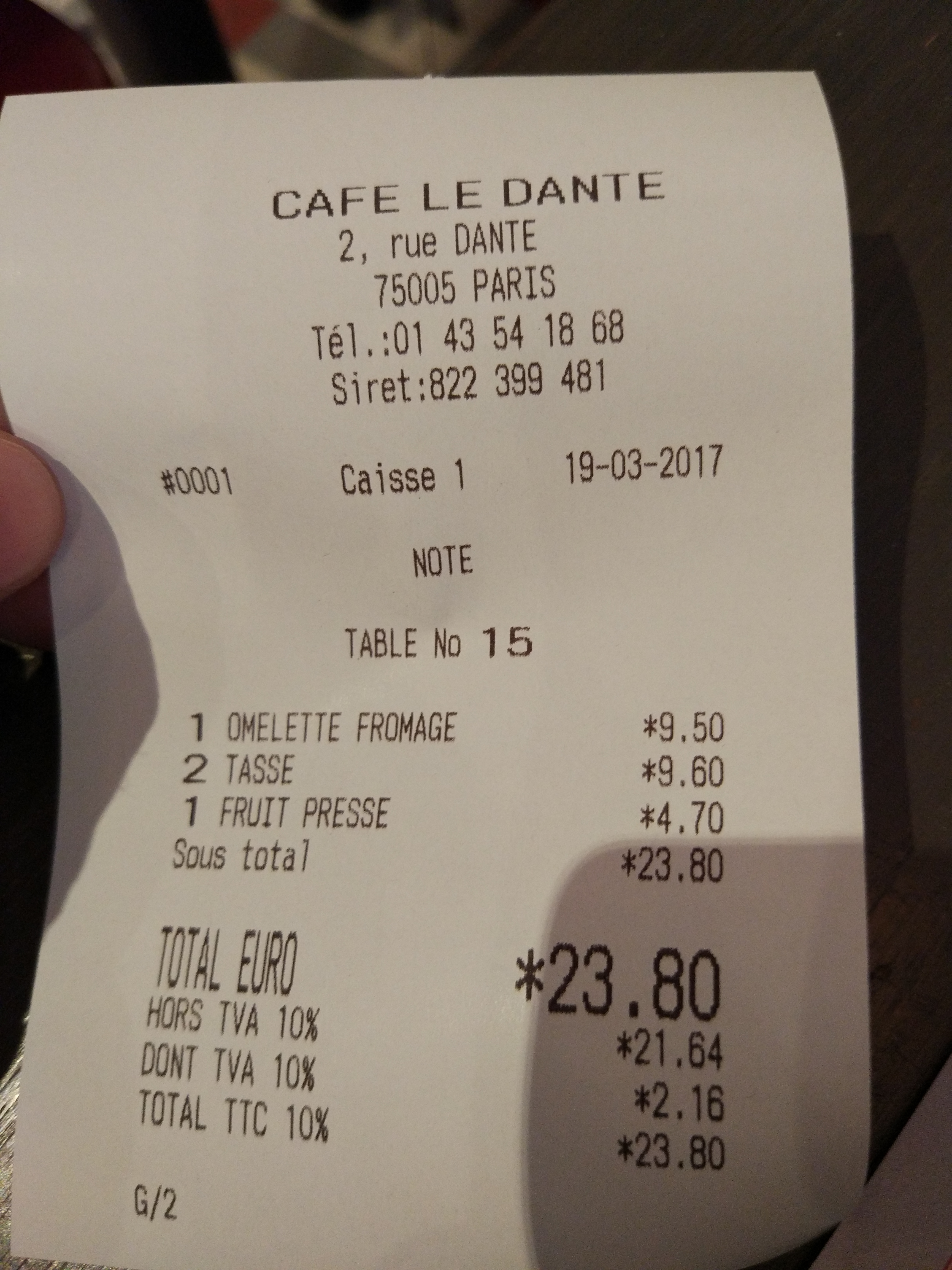 Nous avons remarqué le lendemain que le serveur nous avait facturé une bière deux fois par erreur (18,40€ au lieu de m 9,20€). Après avoir appelé pour prévenir le restaurant, le responsable, très désagréable nous a fait comprendre que nous n’avions pas à l’ennuyer pour une dizaine d’euros. Visiblement cela ne les dérange pas de mal facturer leurs clients qui ne devraient en plus pas le faire remarquer. A éviter. Il y’a assurément de meilleurs endroits à Paris.