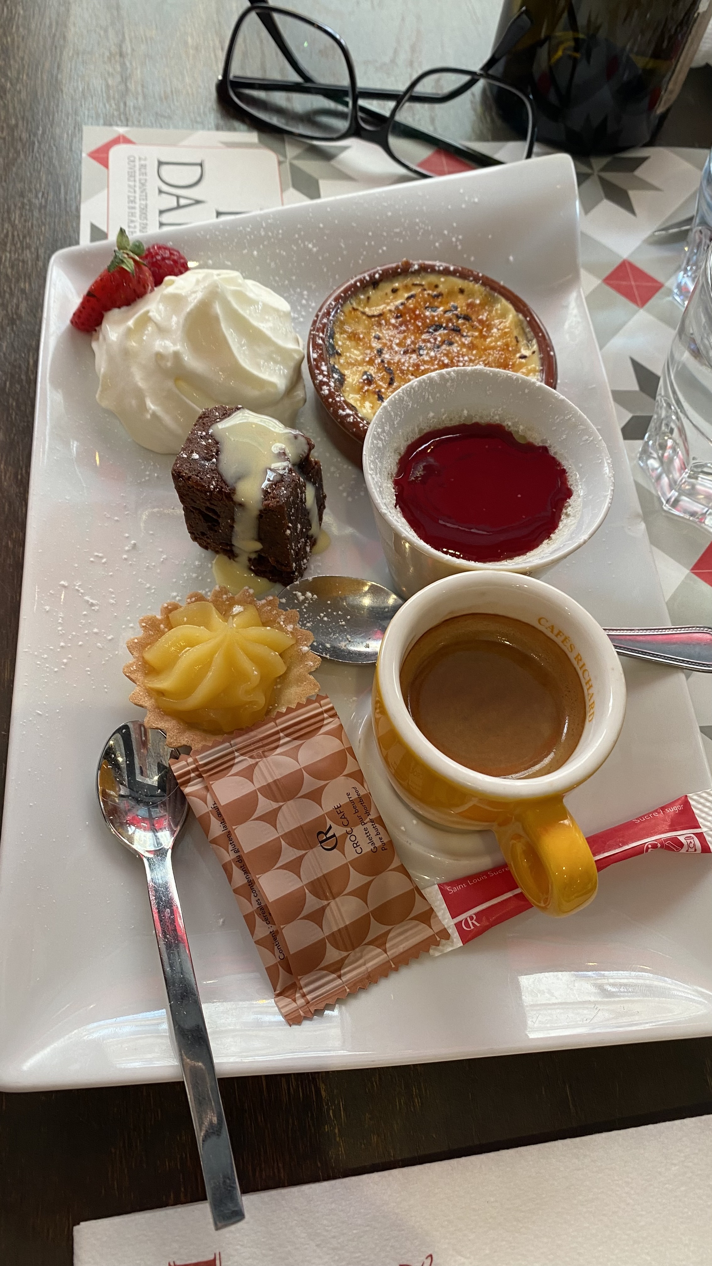 La nourriture était délicieuse, nous avions des salades au canard, du salat au saumon et des pâtes au fromage. Tout était très bien. Le café gourmand était merveilleux. Merci.