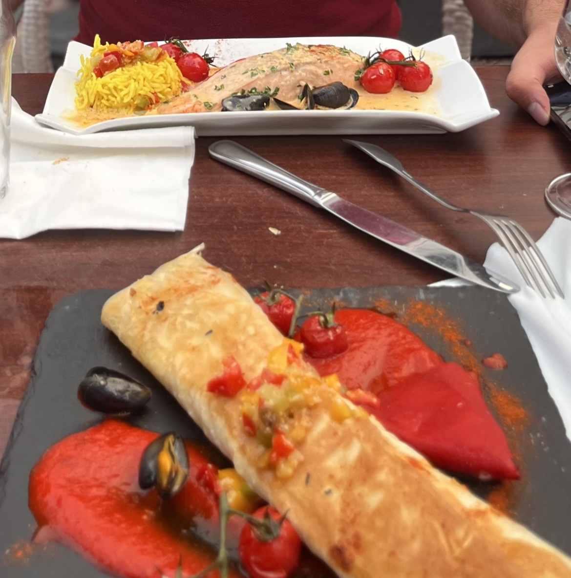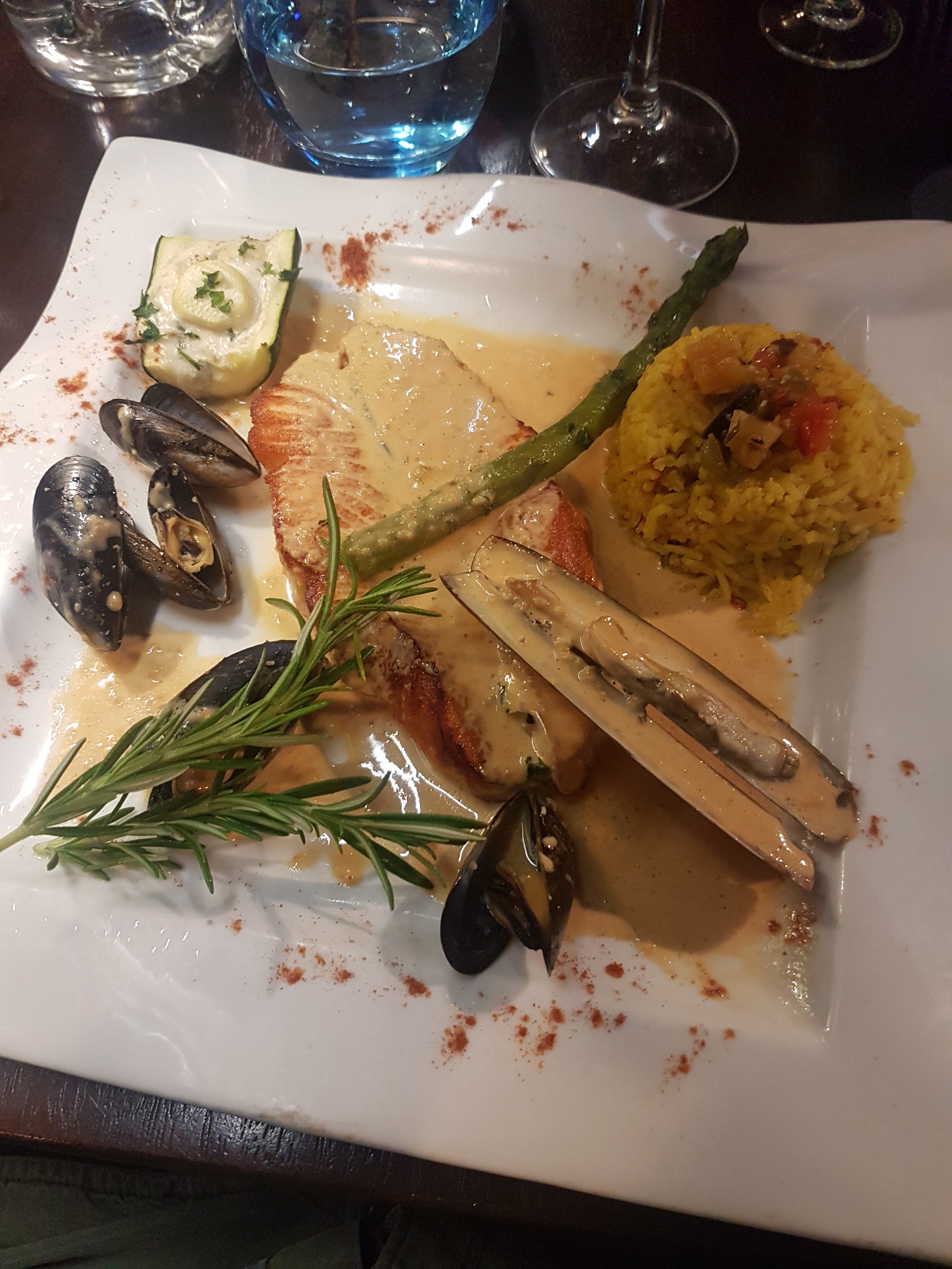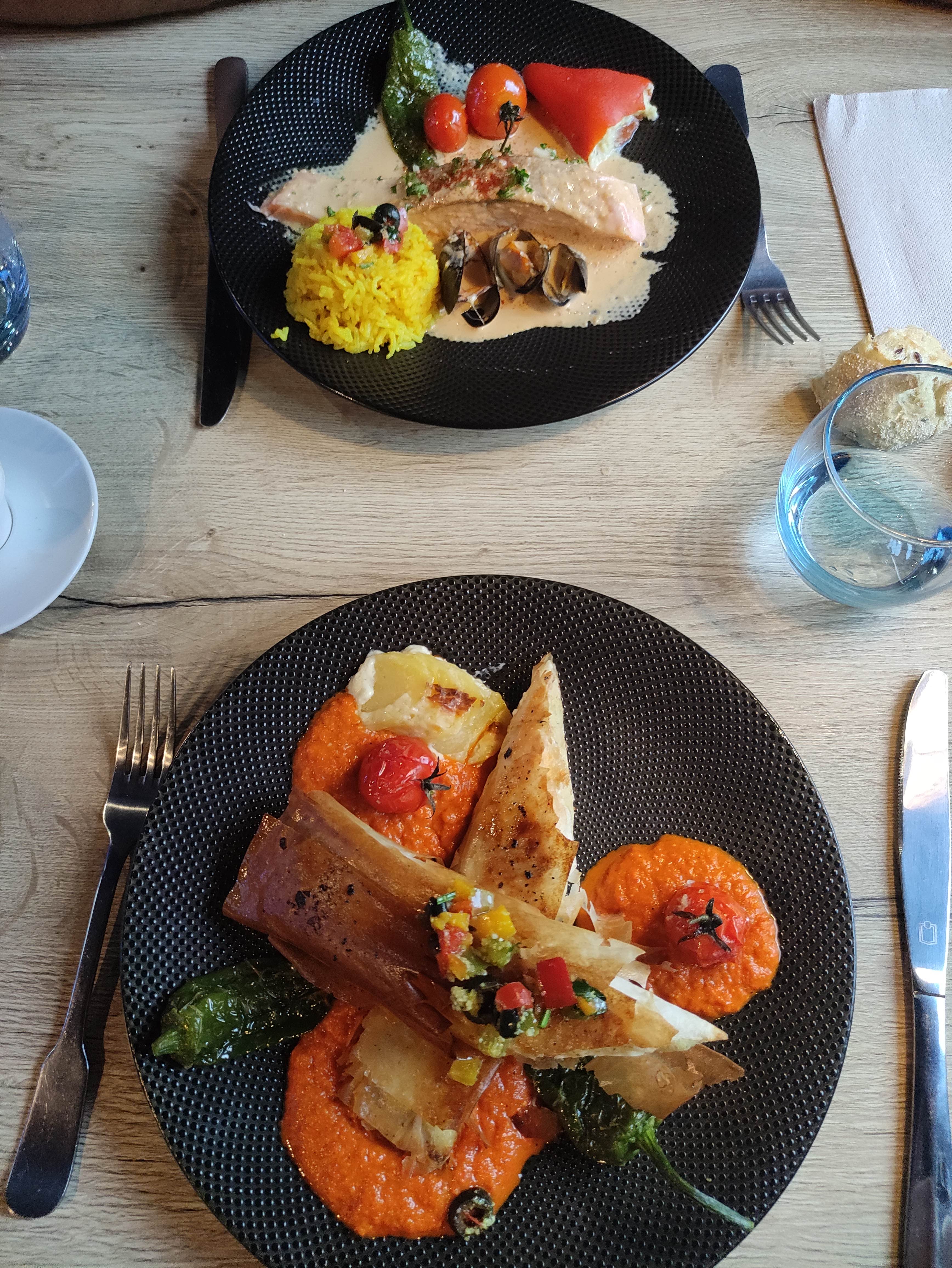 Menu plat + dessert (19.50) Plat : Paella au chipirons et chorizo Plat : Saumon braisé au Jurançon Dessert : Crème brûlée Dessert : Tourtieres pommes, caramel beurre salé C'était bon, et je la paella était bien fait ! Il faisait juste froid, et la table était petite à mon goût ^^ Insta : minhfitcook