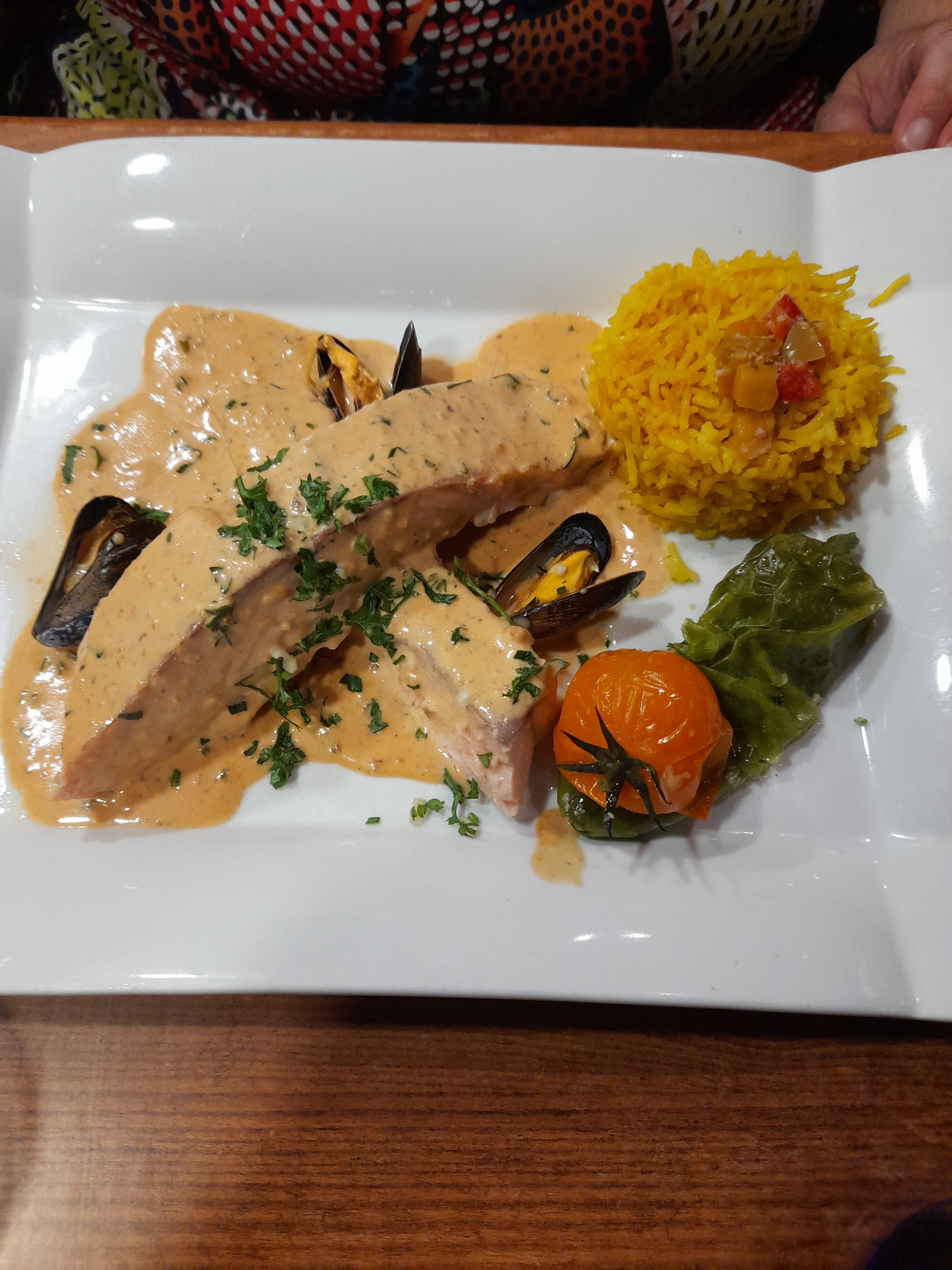 Produits de qualité Poissons accompagnés de bonnes sauces et épices Paela bien garnie en fruit de mer et poisson Desserts excellents Je recommande les yeux fermés