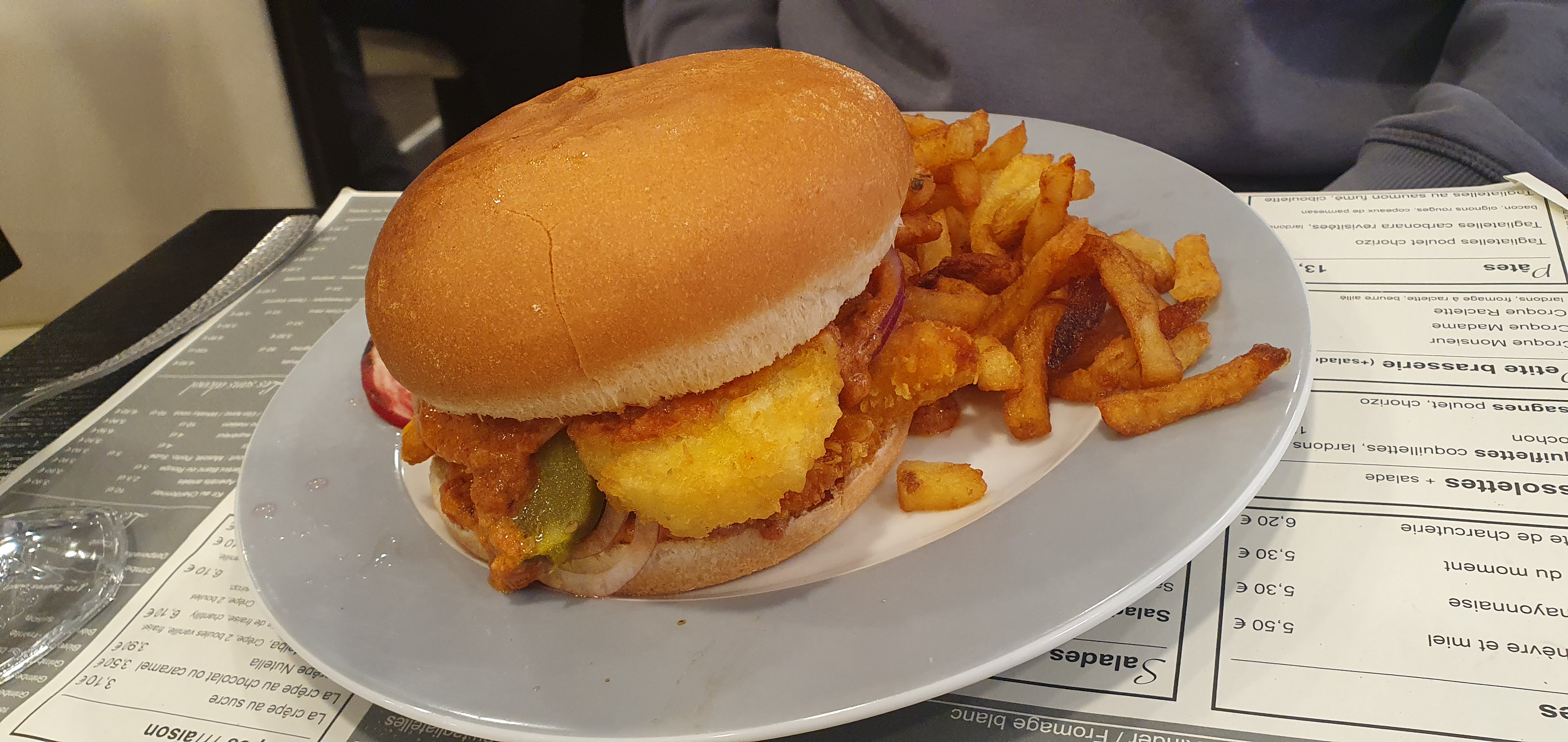 Salut,,, alors je connais bien ce lieu et j'y vais assez souvent, c'est toujours blindé de monde ce qui est plutôt rassurant, rarement déçu par ce qui est proposé, les prix sont corrects par contre pour les plats du jour c NIET!!!! J'avoue être venu vers 13h car je n'ai pas le choix cette heure-là vous n'aurez que la carte... dommage:// L'ambiance est plutôt sympa, pas mal de brouhaha normal vu le monde qu'il y a, bon accueil en général, service de table rapide et efficace, je recommande fortement ! Je me suis pris un hamburger maison, le steak haché a été bien cuit selon mes goûts(bleu pour moi) des frites correct... excellent rapport qualité-prix, 20 € pour un burger plus un apéro.