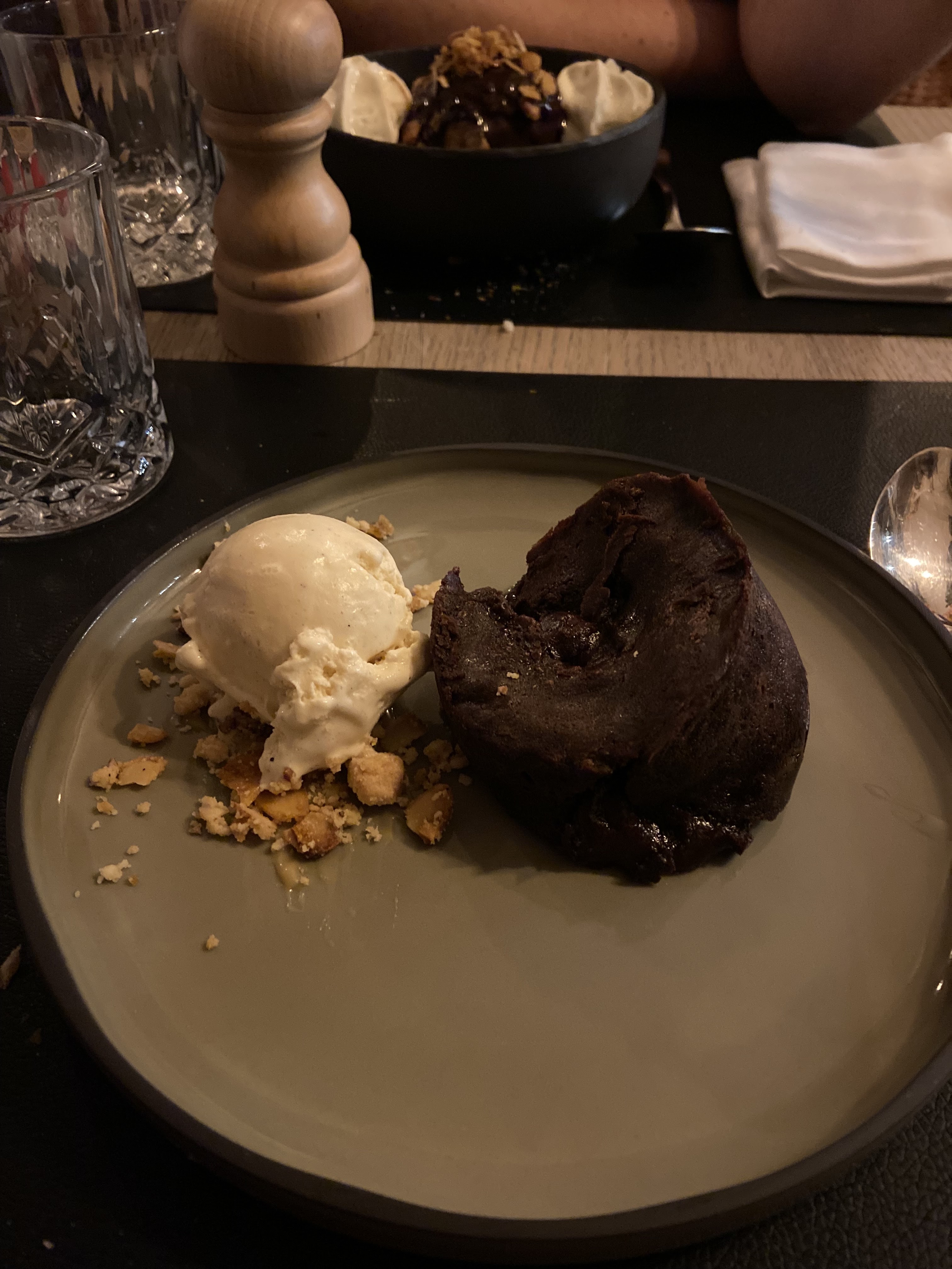 Ambiance cosy et chaleureuse d’inspiration chalet ou restaurant de montagne : nous étions 3 à déguster un tartare poêlé de bœuf et son pesto 🐂 un burger raclette 🍔🧀 un tartare de saumon 🎣 avec des frites à l’ancienne 🥔 excellents 👌 Du vin blanc et rouge au verre excellents 🍷 Un énorme Profiterole avec coulis de chocolat 🍫 et caramel beurre salé amandes avec supplément boule de vanille 🍨 trop gourmand ! Ainsi qu’un Tiramisu Framboise, Citron Vert 🍋 & Gingembre 🫚 très rafraîchissant 👌 (ps : pas de wifi à l’intérieur et la 4G ne passe que très faiblement) Bref on a passé un très bon moment réconfortant 🪵 à bientôt j’espère 🤞