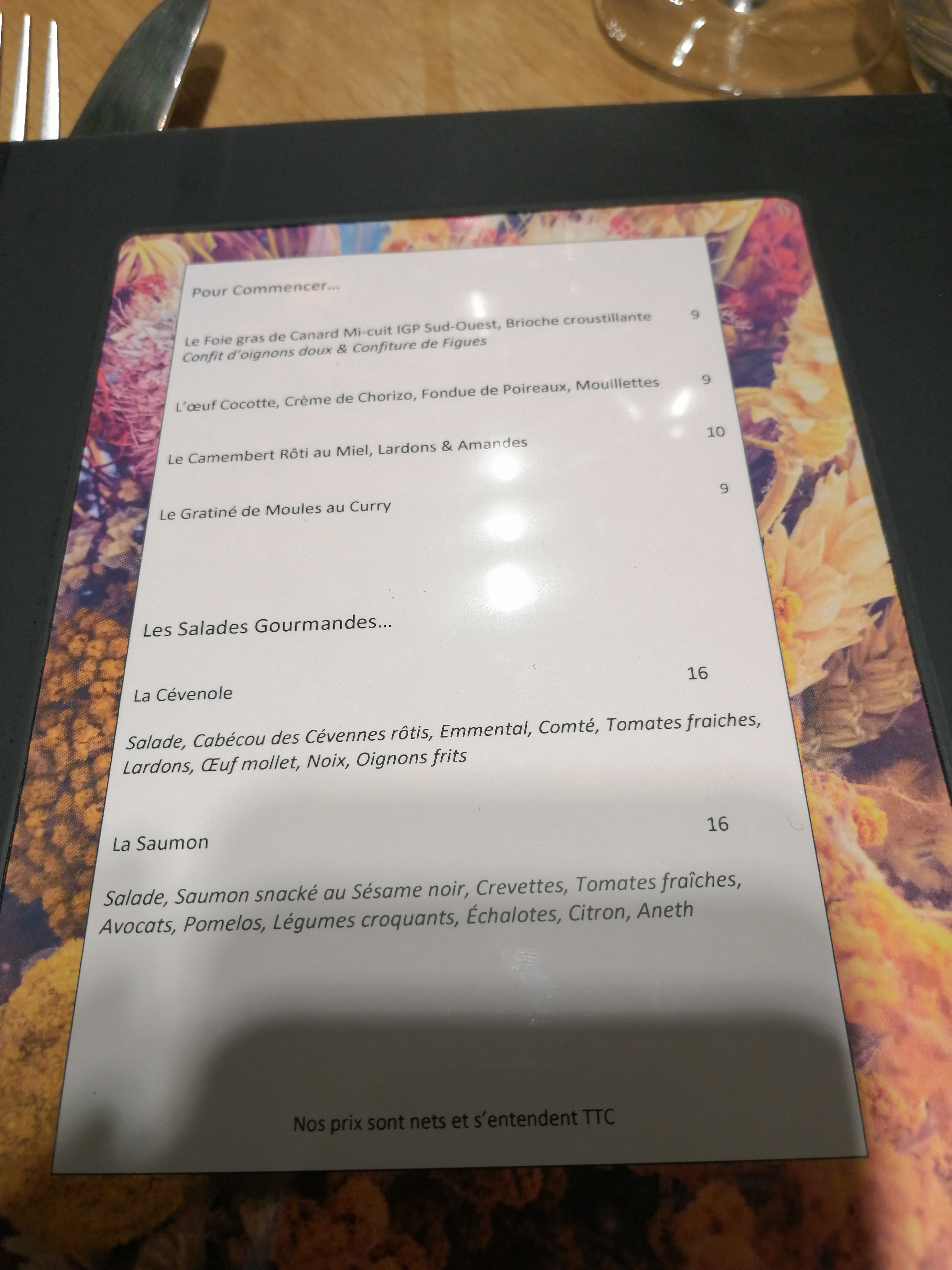 Très bon, l'entrée de foie gras avec brioche, oignons confits et confiture étaient succulent, le burger raclette était à mon goût bien qu'un peut sec, léger manque de sauce, le tiramisu marron speculos était quand à lui parfait.