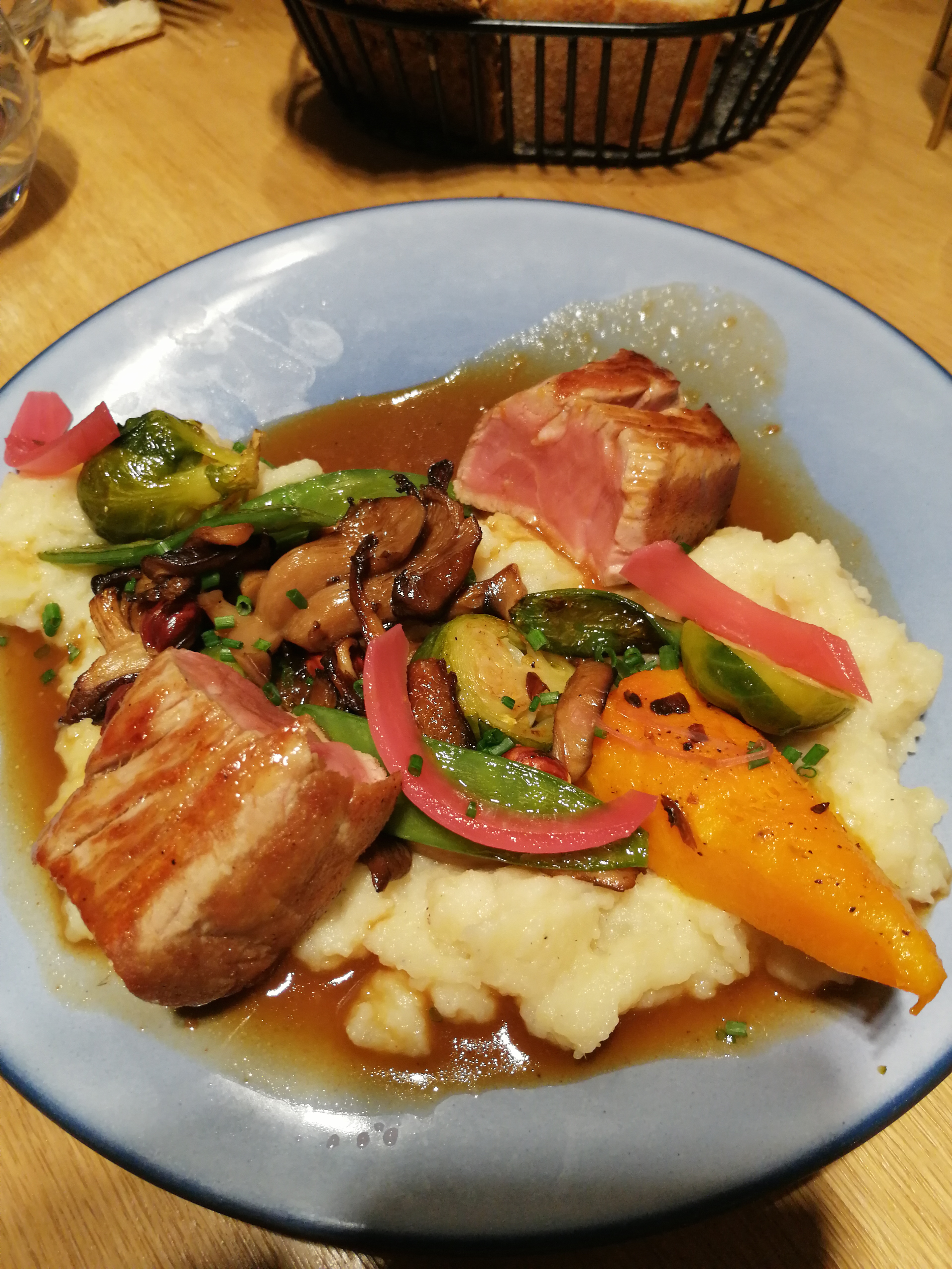 Nourriture de grande qualité. Je voulais vraiment une salade en entrée; cette salade de saumon était l’une des meilleures que j’ai jamais mangées ! Saumon super frais et charnu. Mon ami avait le filet de porc et c'était cuit à la perfection.