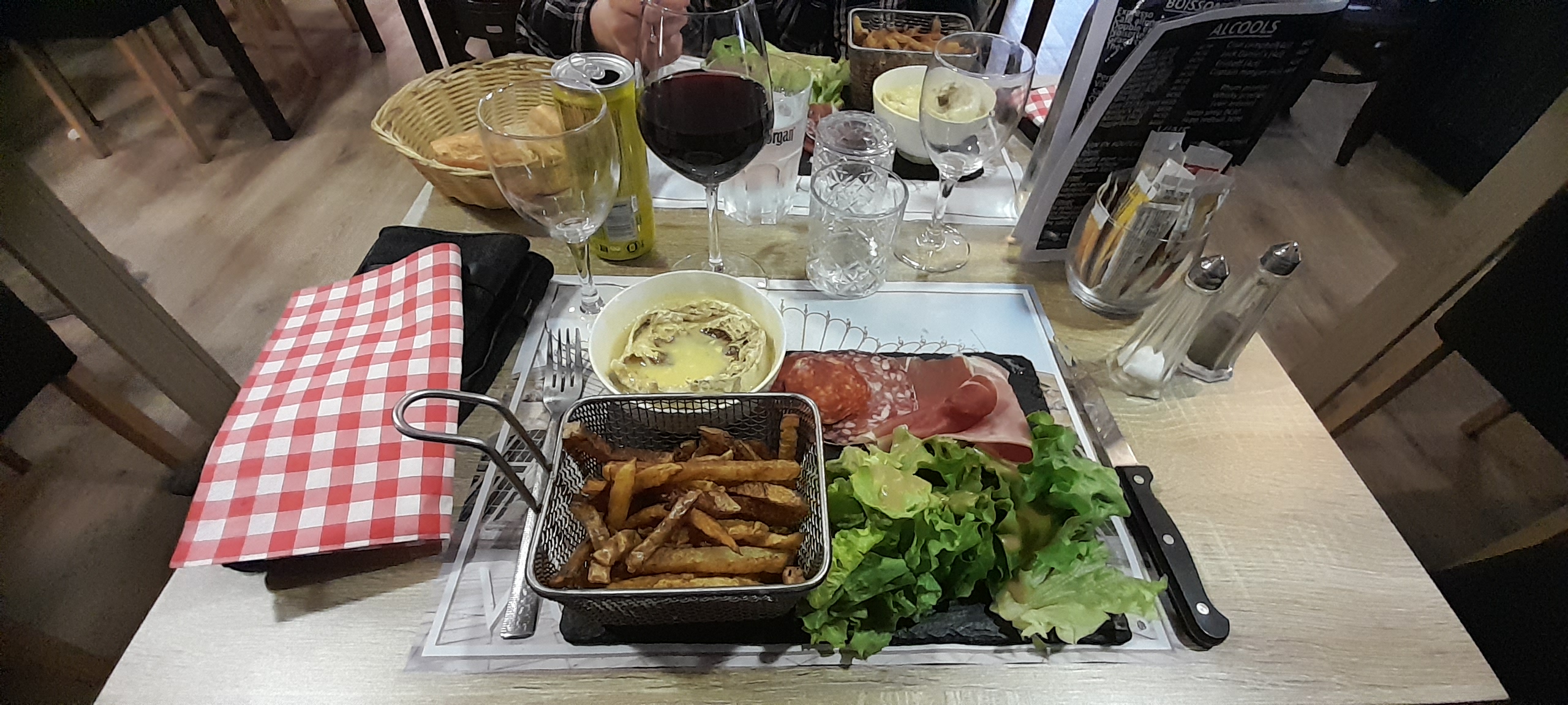 Réservation pour deux personnes, le patron (?) nous laisse le choix entre deux tables. Nous choisissons celle qui se trouve être la plus éloignée du bar. Nous nous apercevons qu'il s'agit d'une table et des chaises de jardin dont l'une est trouée (mesdames attention aux collants...!). Ambiance bar/PMU plutôt que restaurant. On nous conseille la raclette à volonté. L'appareil prend beaucoup de place sur cette petite table. Le serveur propose d'apporter une table d'appoint. On se retrouve avec deux bidons/tabourets pour y déposer les plats de charcuterie et fromage. Ayant l'habitude de fréquenter des restaurants savoyards, le fromage est équivalent à celui que l'on peut trouver en grande surface. Pas de salade verte avec la raclette, un certain nombre de produits en rupture de stock (car beaucoup de couverts servis durant le week-end...). Serveur aimable qui propose de réapprovisionner les plats. Après un long moment d'attente, personne ne vient débarrasser la table et nous proposer la carte des desserts. On s'en va. Dommage...