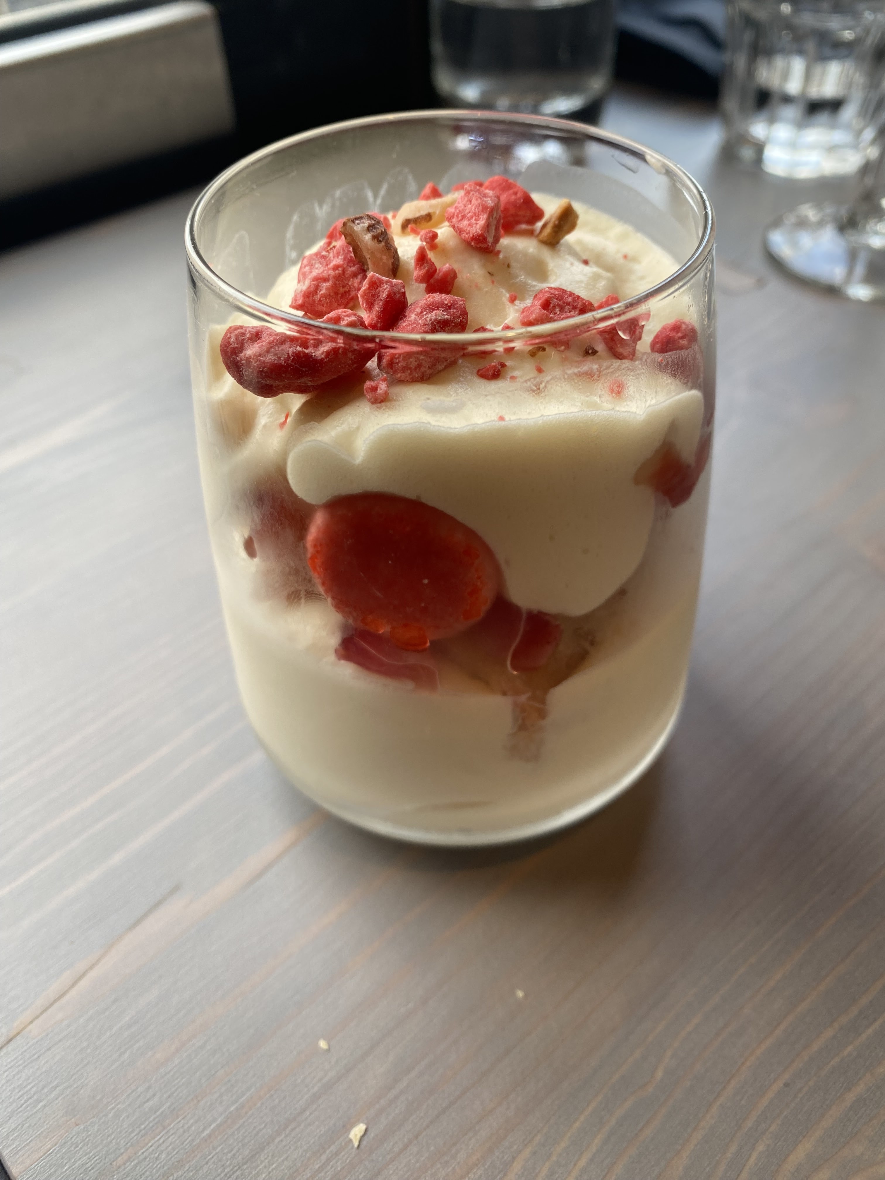 Un déjeuner sur une terrasse ensoleillée, un plat du jour (carpaccio de boeuf avec frites maison) et un dessert (fraise rhubarbe) délicieux et abordables ! Je recommande sans hésitation.