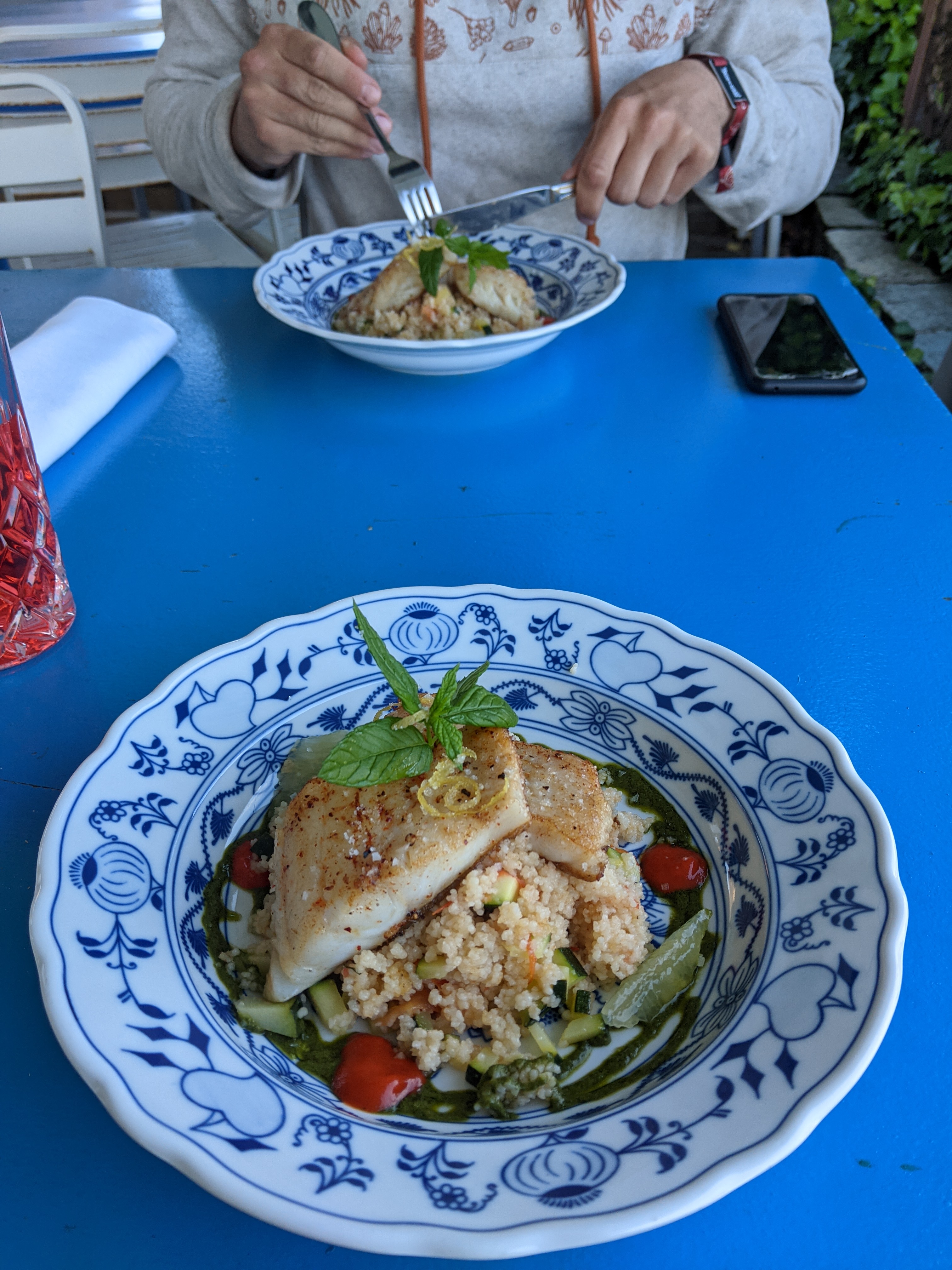 Nous nous sommes sentis très à l'aise ! Cuisine délicieuse dans le cadre magnifique des toits et des jardins sous-jacents du village pittoresque. Le menu était garni de fleurs fraîches et d'herbes du joli potager et était finement réglé à tous égards ; j'ai rarement mangé quelque chose d'aussi délicieux. Les hôtes sont des Suisses très sympathiques qui mettent beaucoup d'amour dans chaque détail.