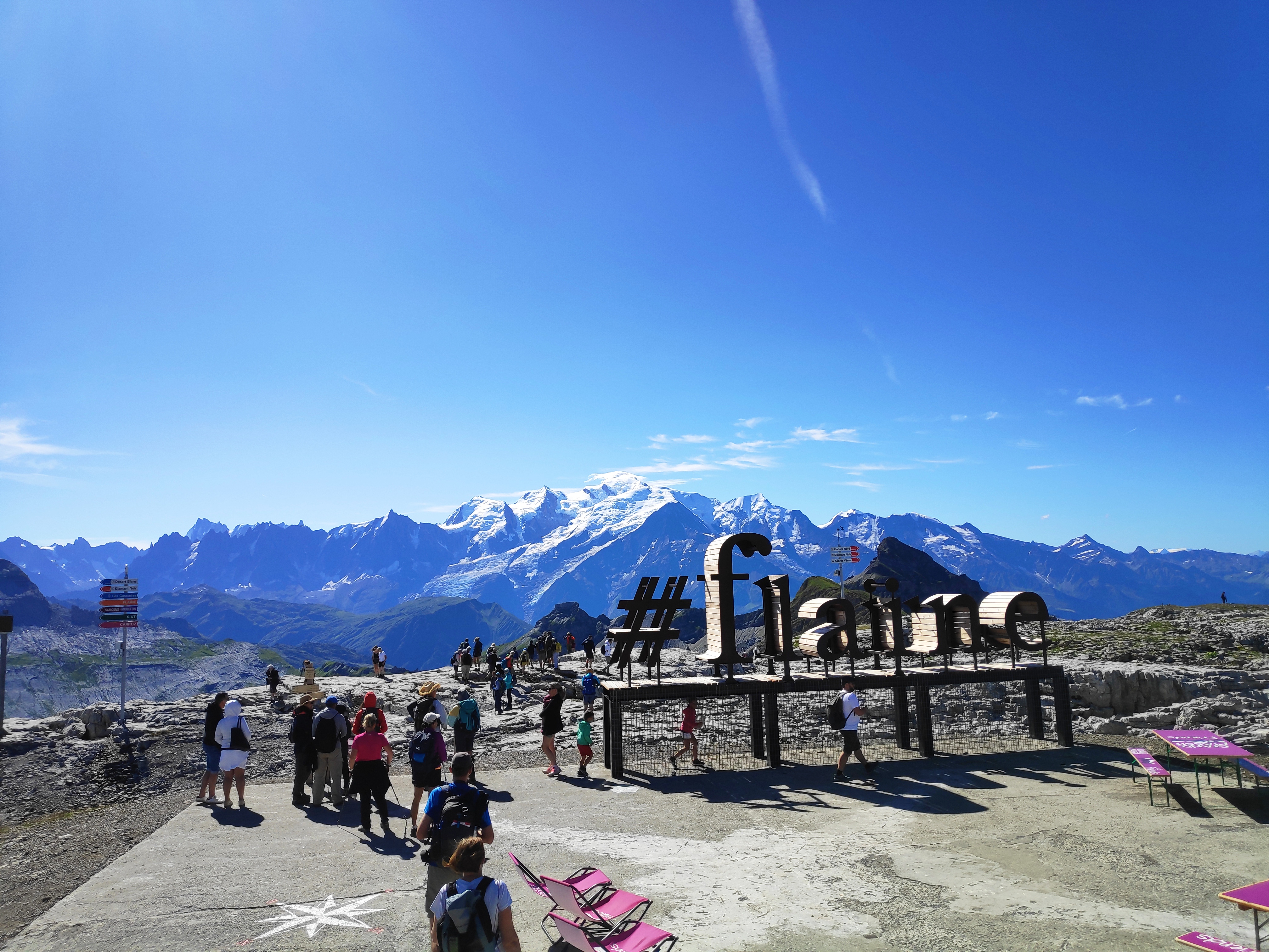 Terrasse magnifique face au Mont Blanc à l'arrivée du DMC, équipe sympa, le top