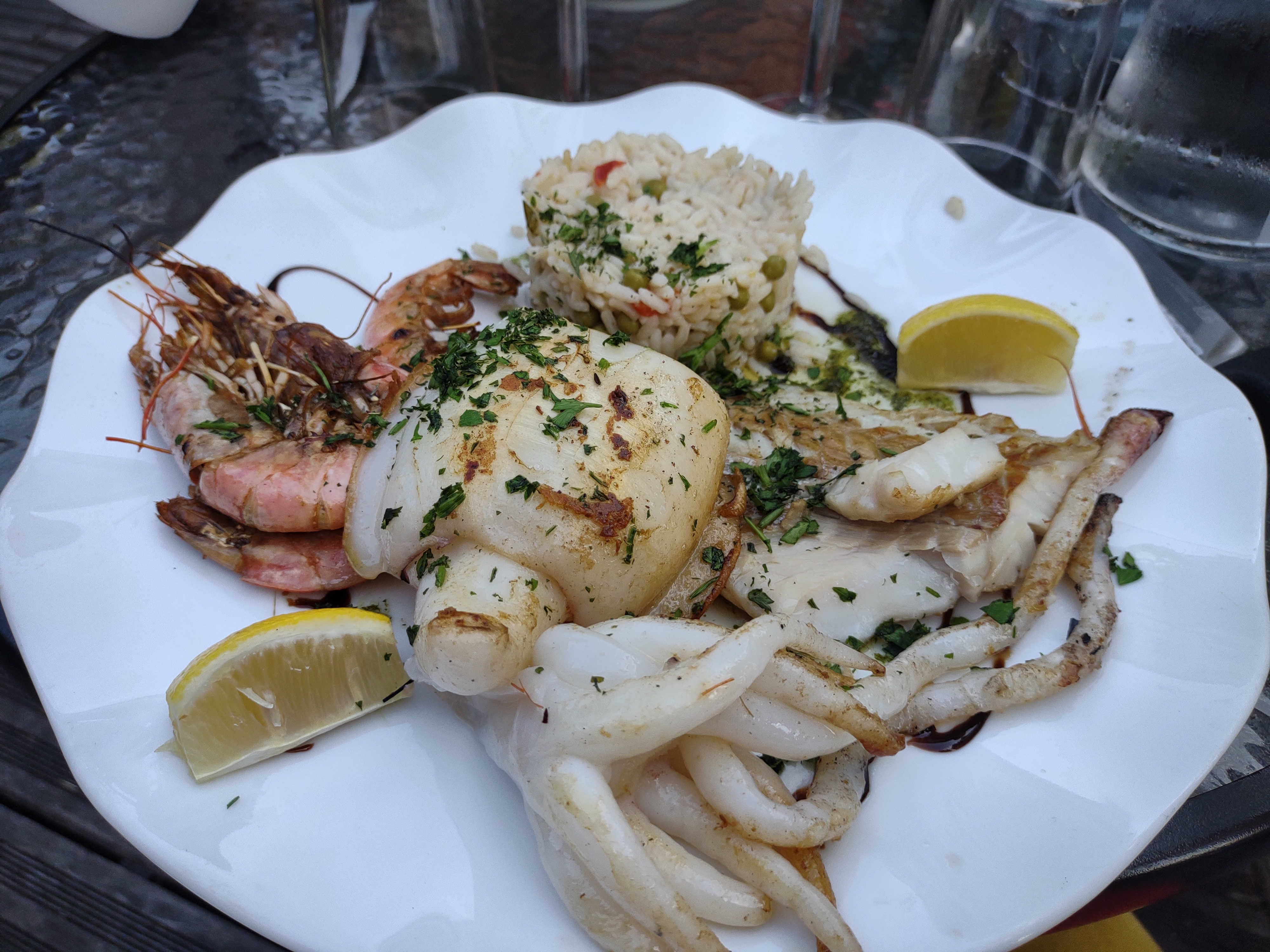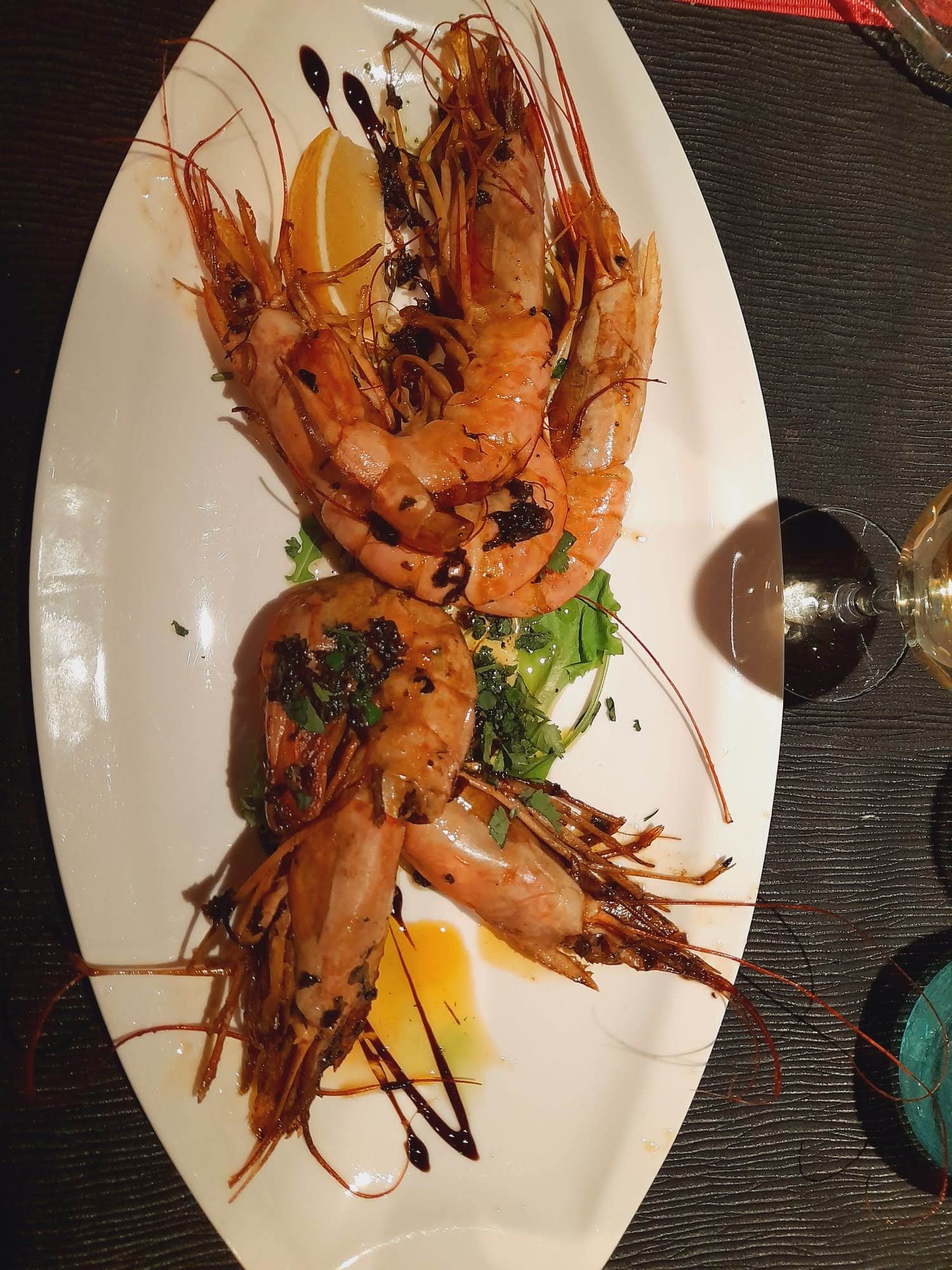Cadre magnifique tout en pierre. Magnifique brochette Gambas, seiches, et poisson. Personnel au top