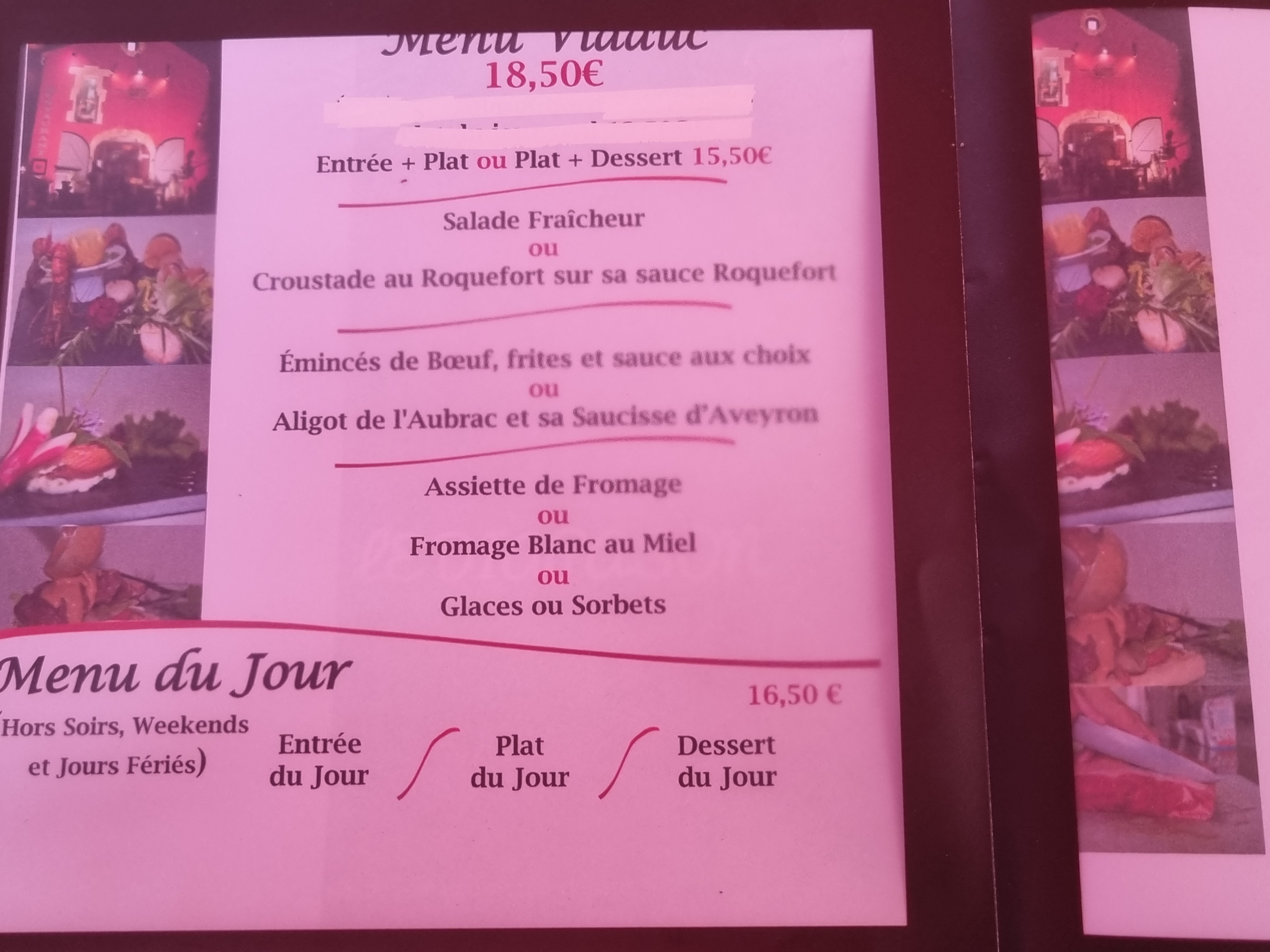 Menus sur la pancarte d’accueil et entrée plat dessert attirant mais non respecté. 12h15 entrée proposée plus disponible et dessert remplacer par un vulgaire bout de roquefort. Quantité vraiment médiocre heureusement le goût y était. Au moment de payer nous avons eu le malheur de demander une fiche sans détails, apparemment c’est trop demandé pour la patronne qui devrait vraiment prendre sa retraite au lieu de crier sur ses clients pour cacher son incompétence. Bref je n’y mettrai plus les pieds.