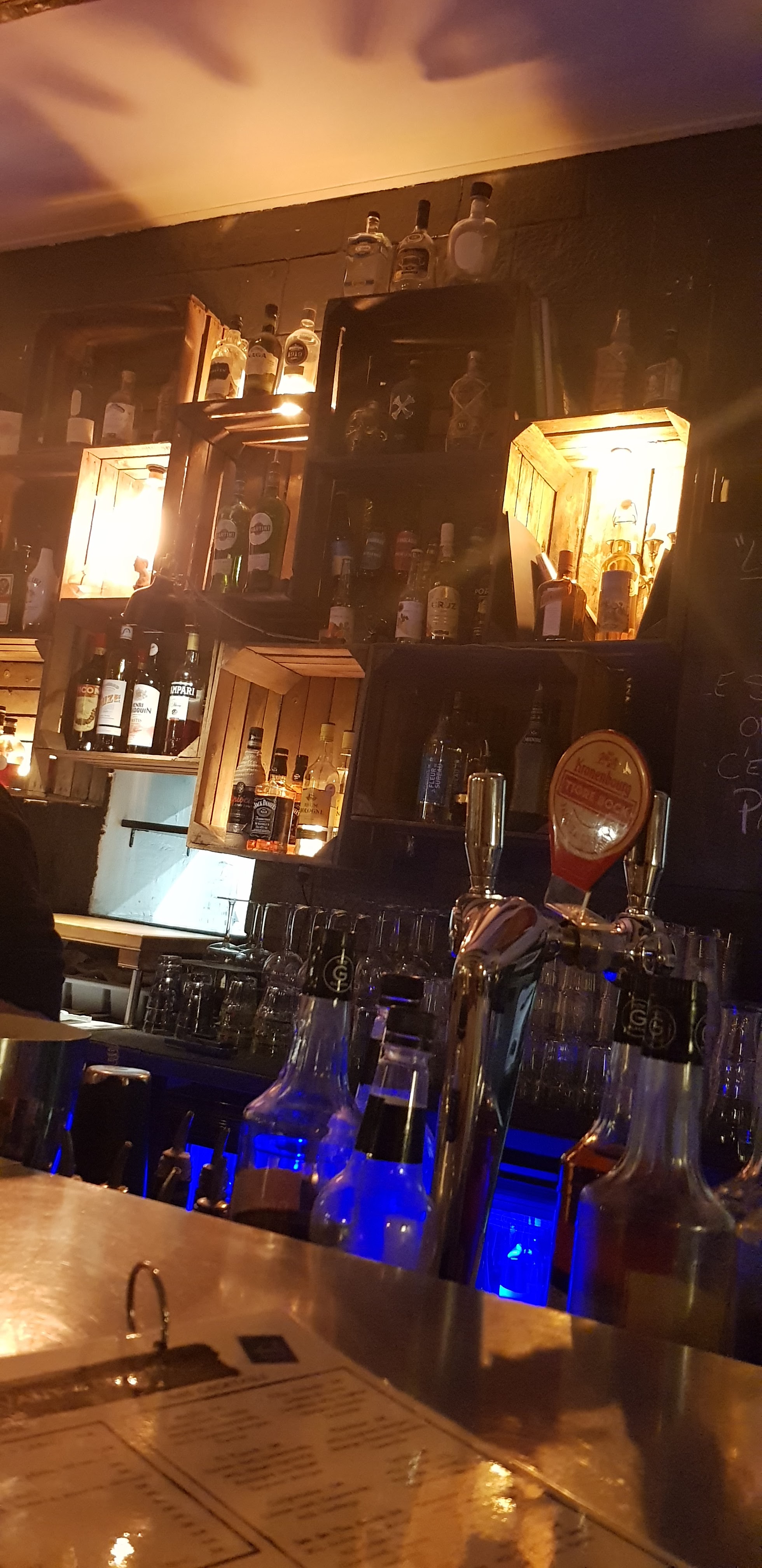 On sent des l'entrée que l'on penetre en un autre monde Nous sommes les bienvenus chez Dimitri & Jonathan Petit bemol la lumière insuffisante pour lire le/les menus et cartes Écoutez la proposition du jour entrée plat ou dessert Les 2 pstrons sont à ka tache alors l'impossibilité de ??? N'existe pas Oui oui oui j'ai aime Lucien/laurence/ghislaine/alessandro