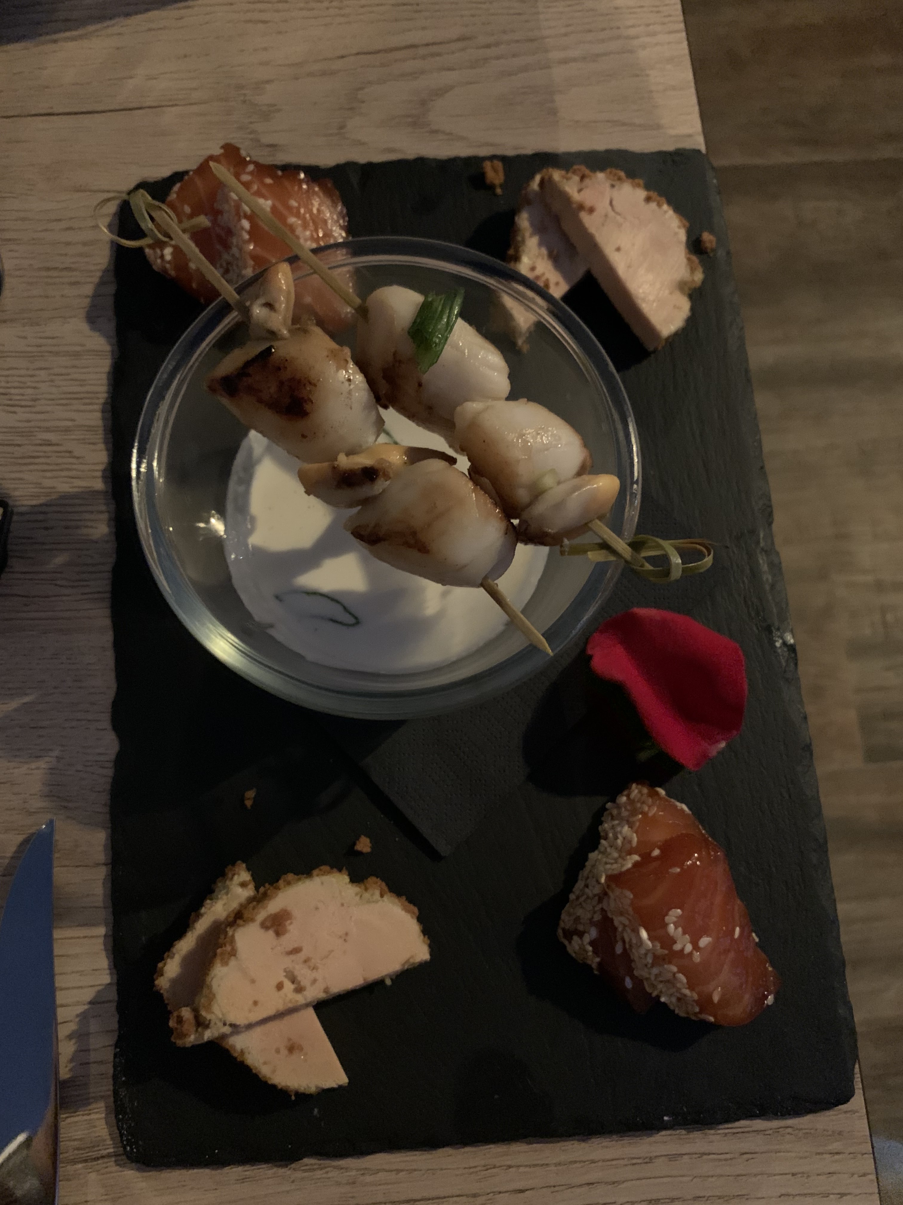 Apéro super réussit !!!musique d ambiance Accueil sympathique ! Chablis 👍foie gras 👍👍et même la glace et la Chantilly sont top !!! Je n'aime pas les glaces mais la !la Chantilly m'a fait de l'oeil et tout est bon! A très vite!!!!