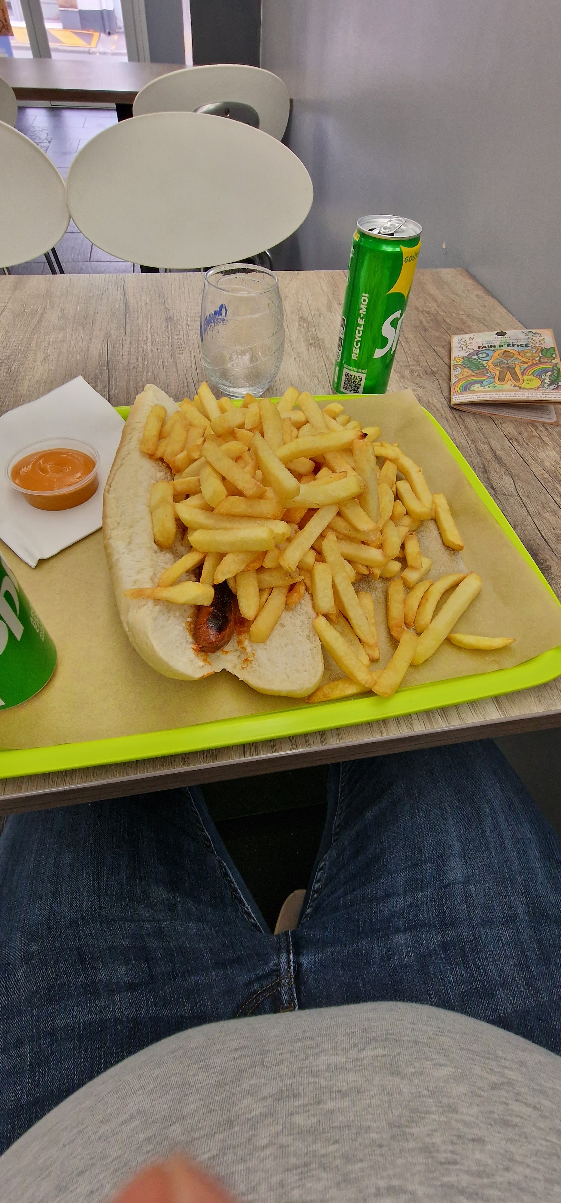 Le pain baguette est à revoir. Les frites pas assez dorées, molles et se défont . Il y a des jours meilleurs pour les frites, tout dépend de qui réalise la cuisson. Dommage car le service est rapide, et les autres produits sont bons. Le point noir , c'est vraiment la baguette. Vraiment pas sérieux pour une friterie du centre ville.