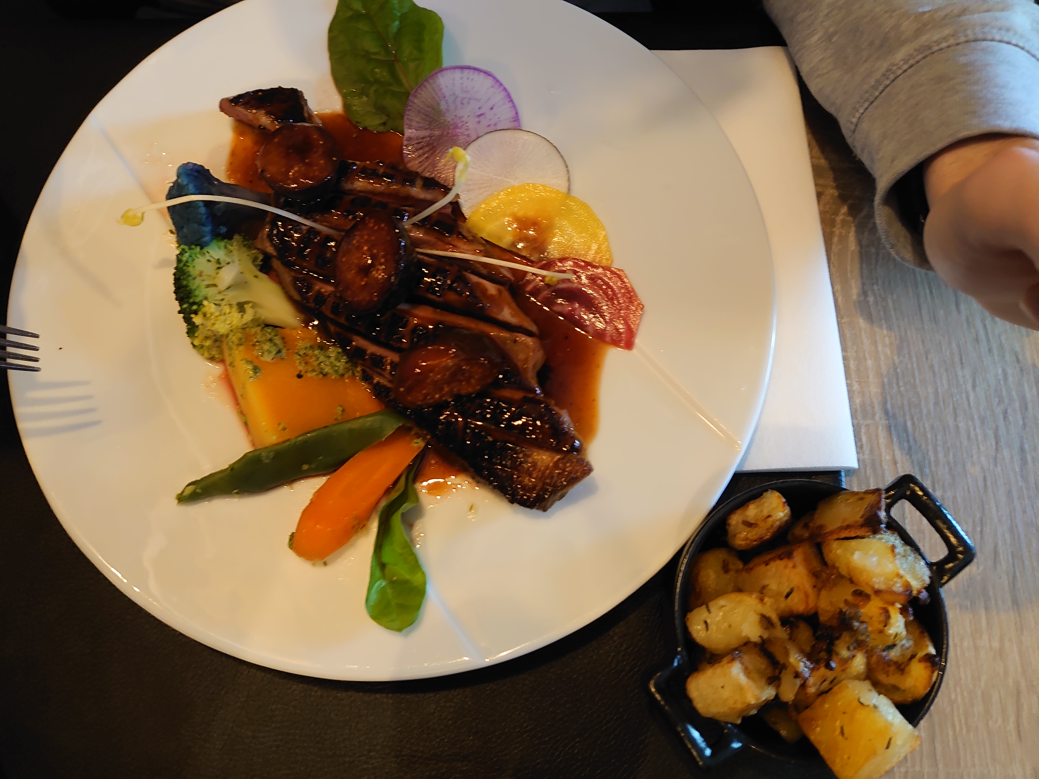 Juste parfait Service rapide et souriant Les plats sont magnifiques et délicieux La cuisson de mon magret était parfait Et l’ananas en dessert hummmmmmm Je recommande sans hésitation