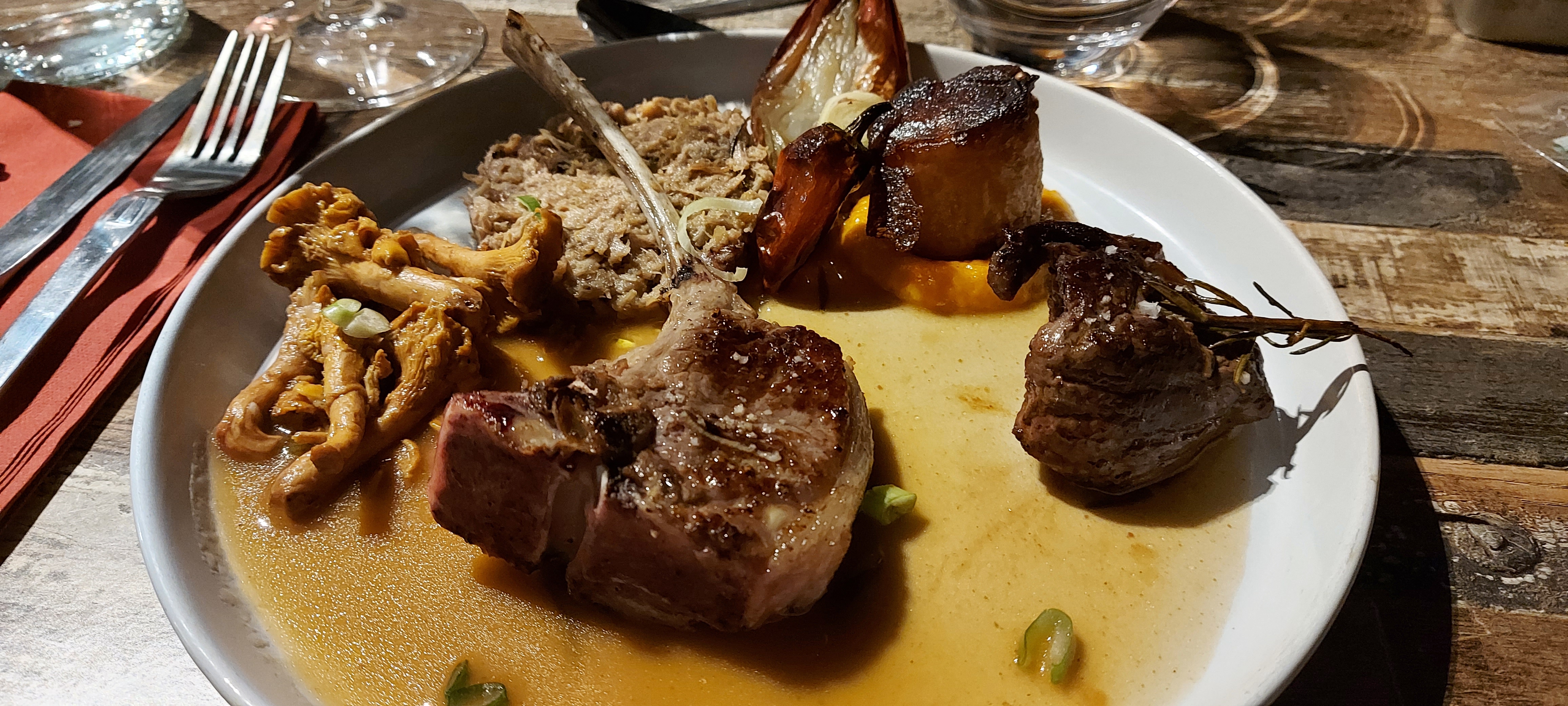 Joli dans l'assiette et savoureux. Le trio d'agneau était excellent, et le Luberon rouge gourmand à souhait pour l'accompagner. 😊