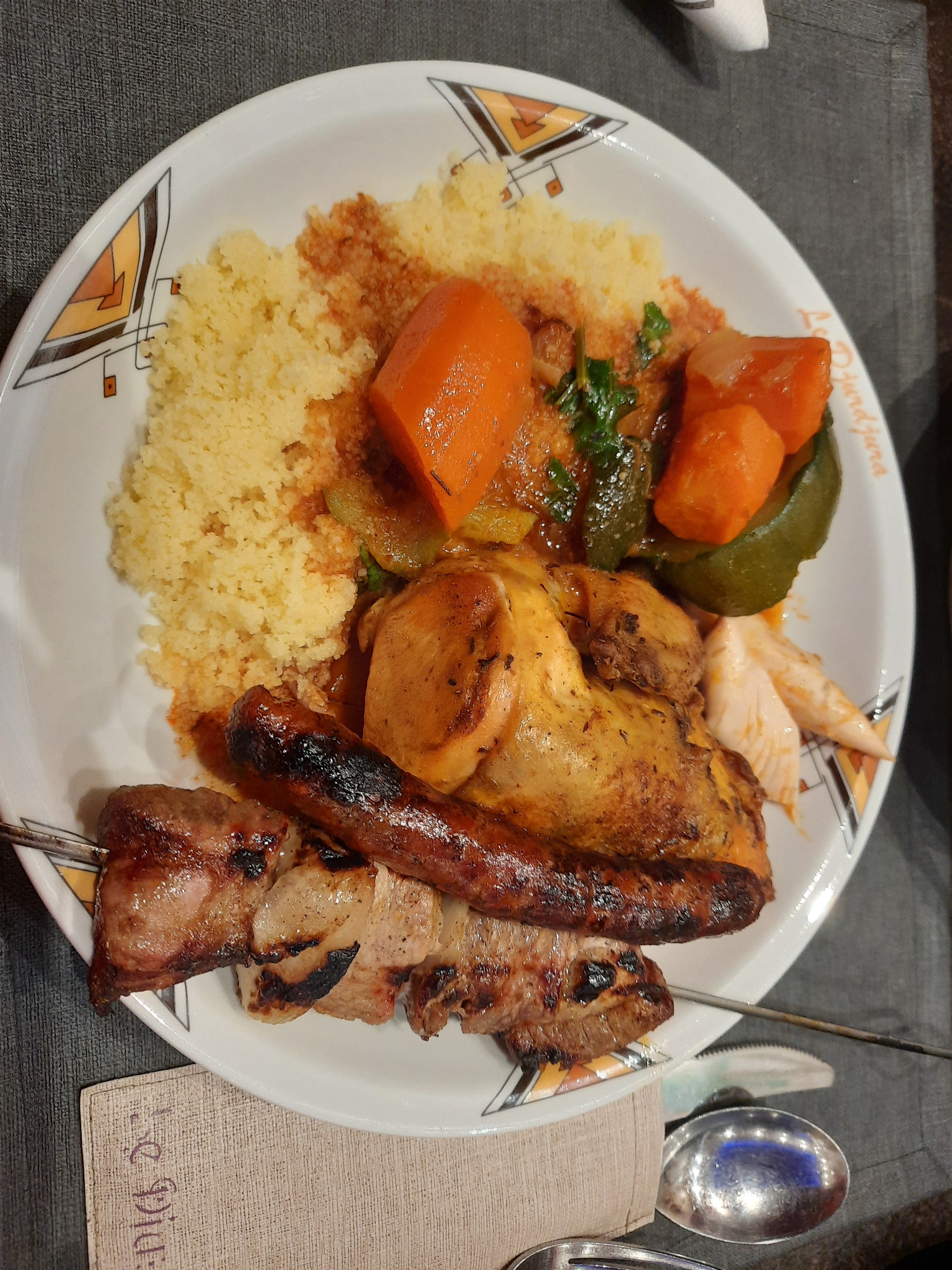 Tres bon couscous !!! Les brochettes d'agneau succulentes. Tajine copieux Tartelette aux figues un délice . Accueil très sympa. Sourire et bonne humeur du personnel Un plaisir à renouveler..une quatrième fois 😍