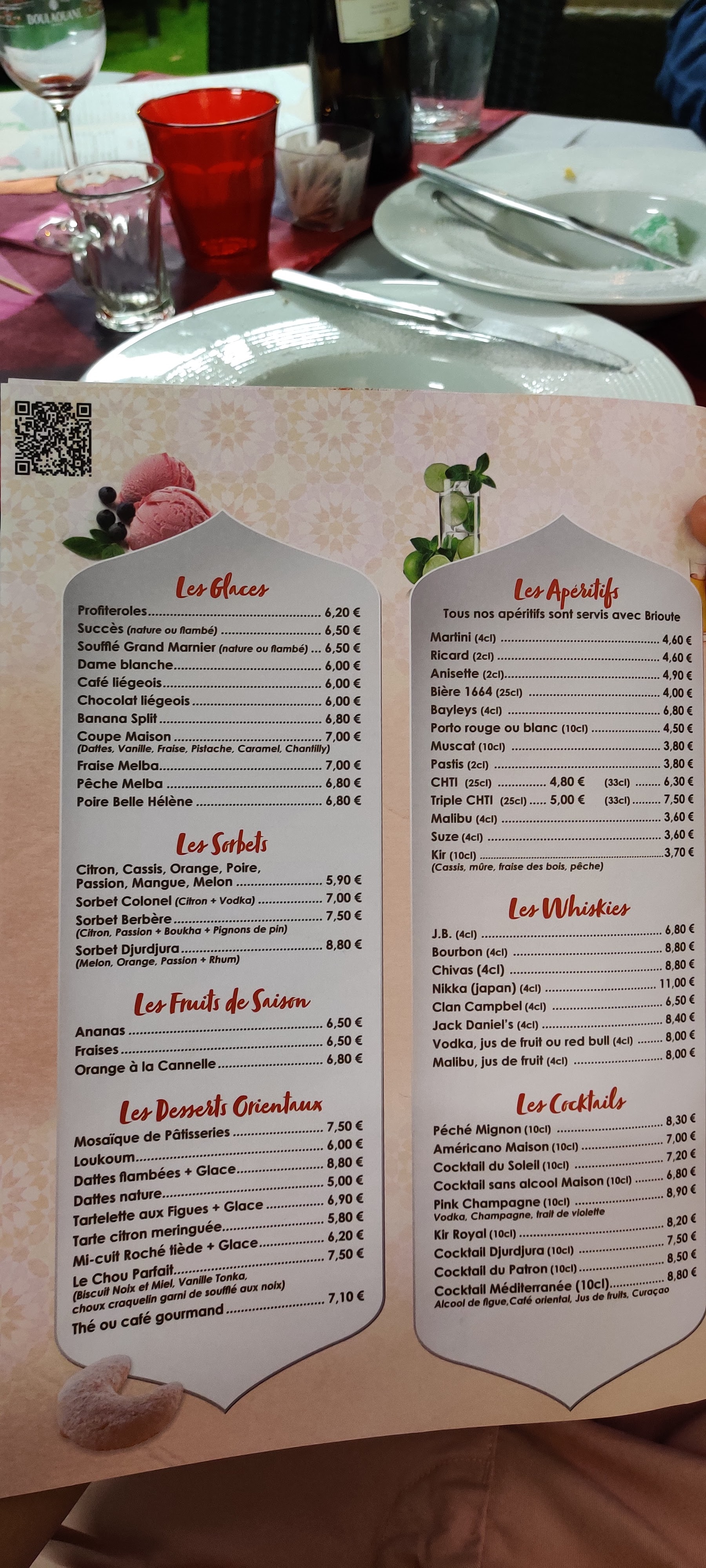 Bonsoir, restaurant au top, c'est la 1ère fois que nous venions en famille, ma fille et mon mari se sont régalés avec le couscous, ils étaient ravis. Moi j'ai pris émincés de poulet à la crème maroilles, crème très bonne, frites parfaites, par contre il y avait quelques émincés de poulet qui n'était pas bien cuit c'était encore rose à l'intérieur, j'en ai parlé au serveur. Pour le dessert, j'aurai préféré avoir ma dame blanche dans une coupe normale et non dans une coupelle allongée, je n'ai pas pu en parler au serveur. A part ça c'était trop bon, nous nous sommes bien régalés, les 2 serveurs très agréable et gentil. Je recommande ce restaurant à 100 %. Nous reviendrons et là je prendrai un couscous. Le thé à la menthe avec de la fleur d'oranger juste trop bon. Merci