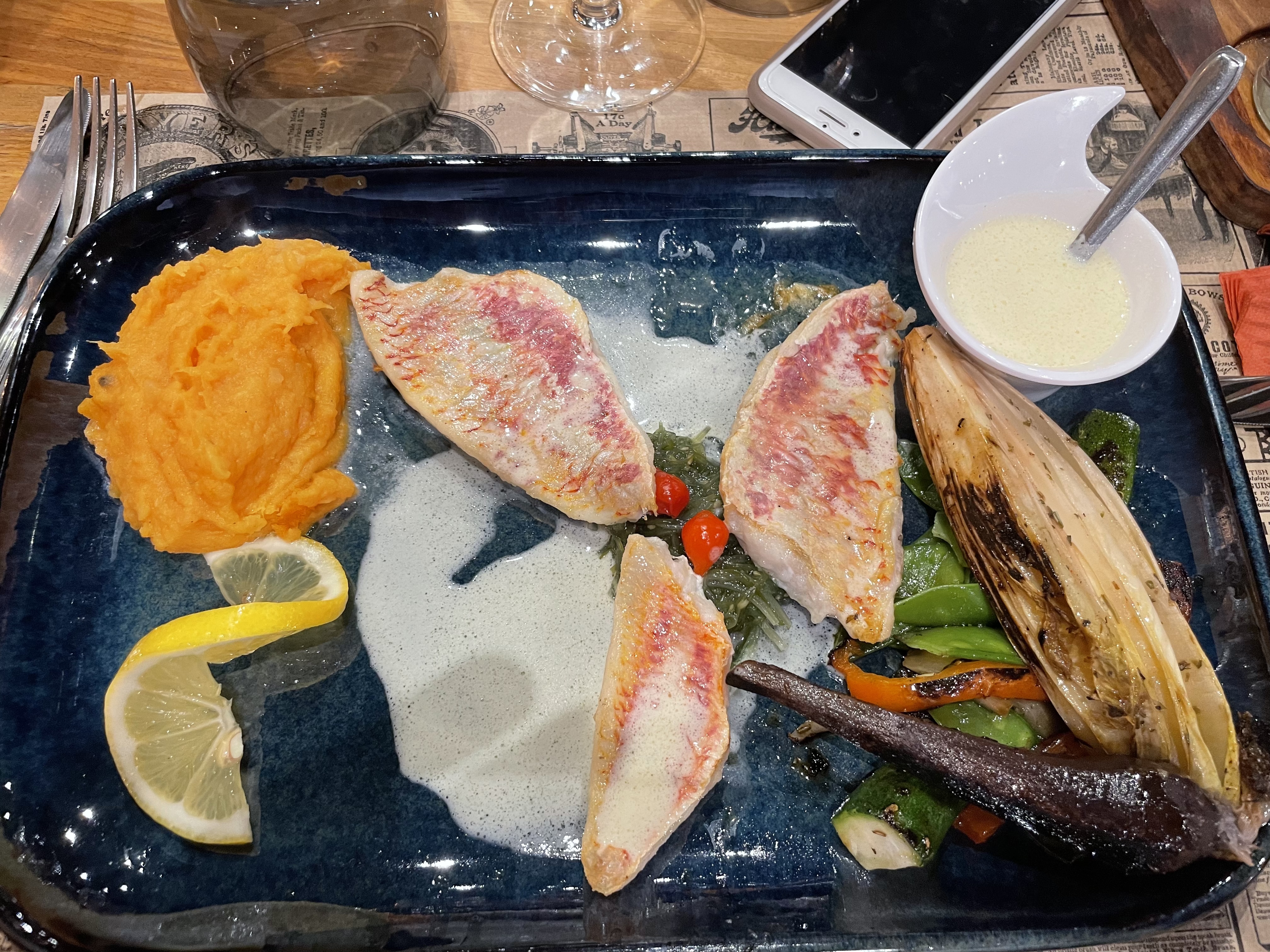 Un véritable régal : poulpe, pluma le tout parfaitement cuit. Une purée de patate douce à tomber et des sauces 👌