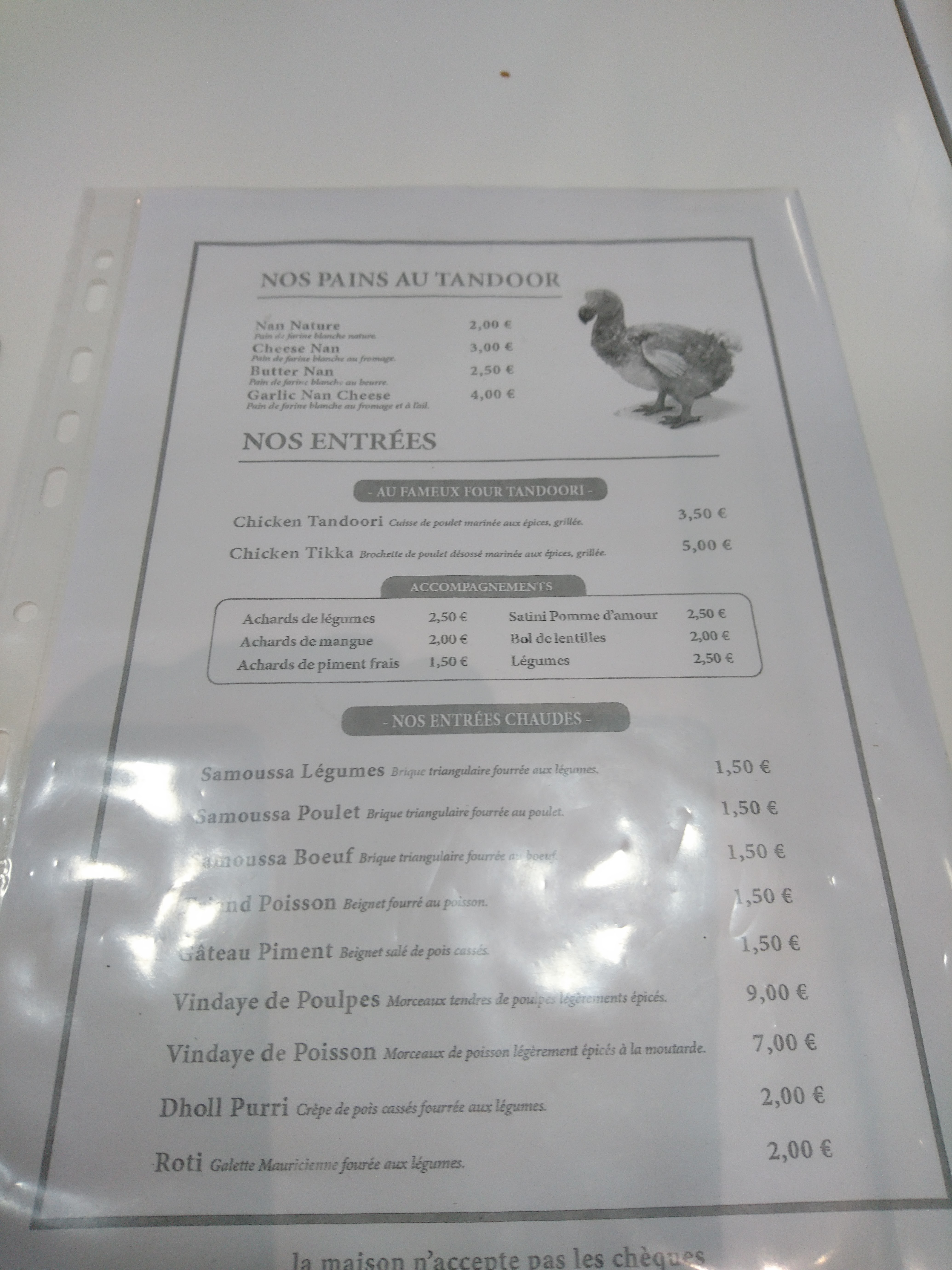 Je connais ce restaurant depuis très longtemps, or je n'y vais pas souvent Ce lundi je suis passé prendre 12 paires de Dholl Purri... Les légumes étaient moisis voir pourris ! Ma fille et moi même avons fait une intoxication alimentaire ; sans parler des Sultafines qui n'étaient pas top du tout Conclusion : Restaurant qui a bien changé et qui n'est plus ce que c'était dans le passé.