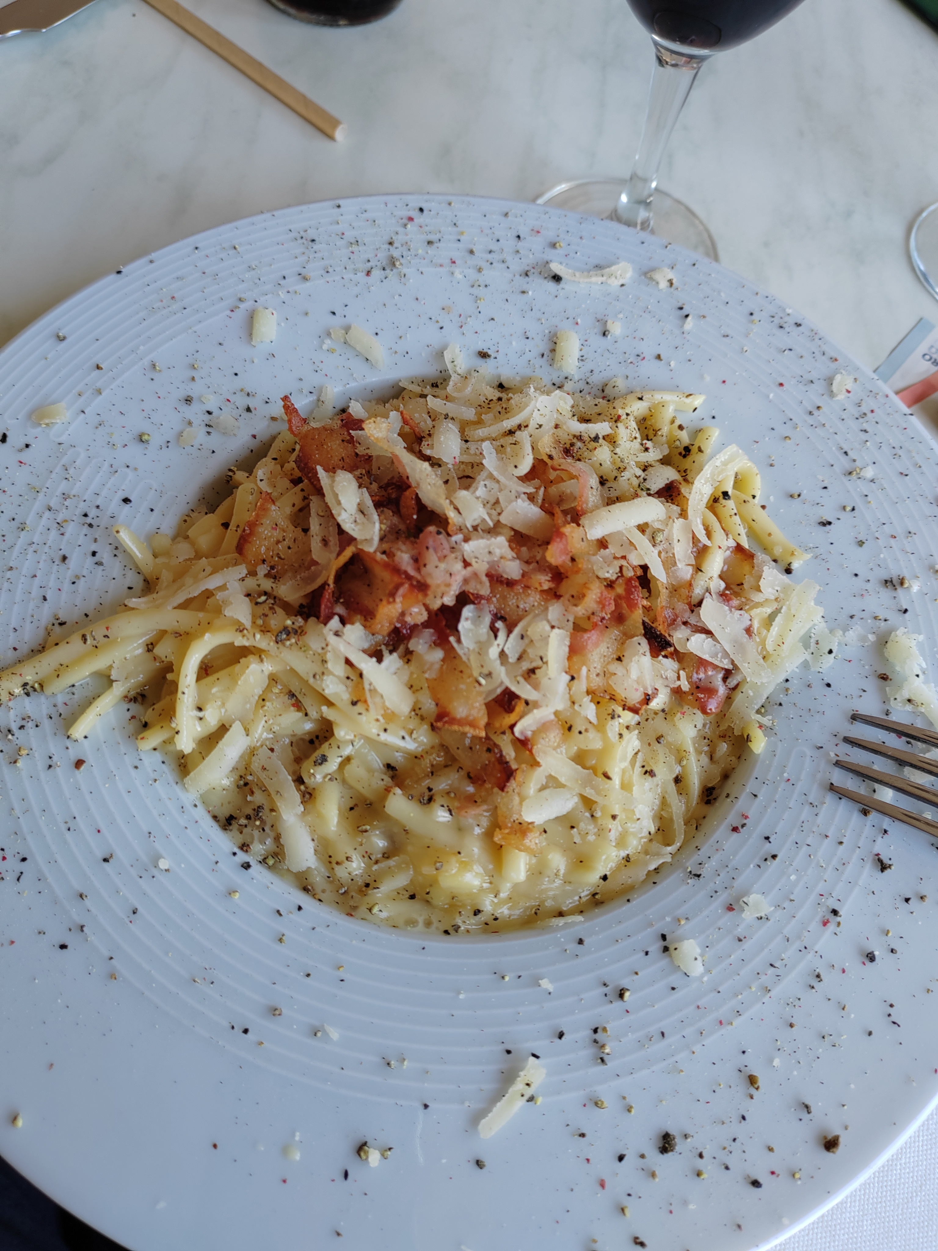 Nous avons été agréablement surpris par ce restaurant notamment parce propose un plat qui n'est pas souvent à la carte dans les restaurants italiens en France. Il s'agit de cacio y pepe. C'est un de nos plats italiens préférés et nous avons été vraiment très heureux de pouvoir le déguster. L'aubergine était excellente également, le service rapide et convivial. Même le prosecco etait bon, ce qui n'est pas toujours le cas dans les restaurants italiens, surtout à ce prix-là, car leurs prix sont vraiment raisonnables. Le cadre sous les arcades très agréable. Vraiment une adresse à retenir.