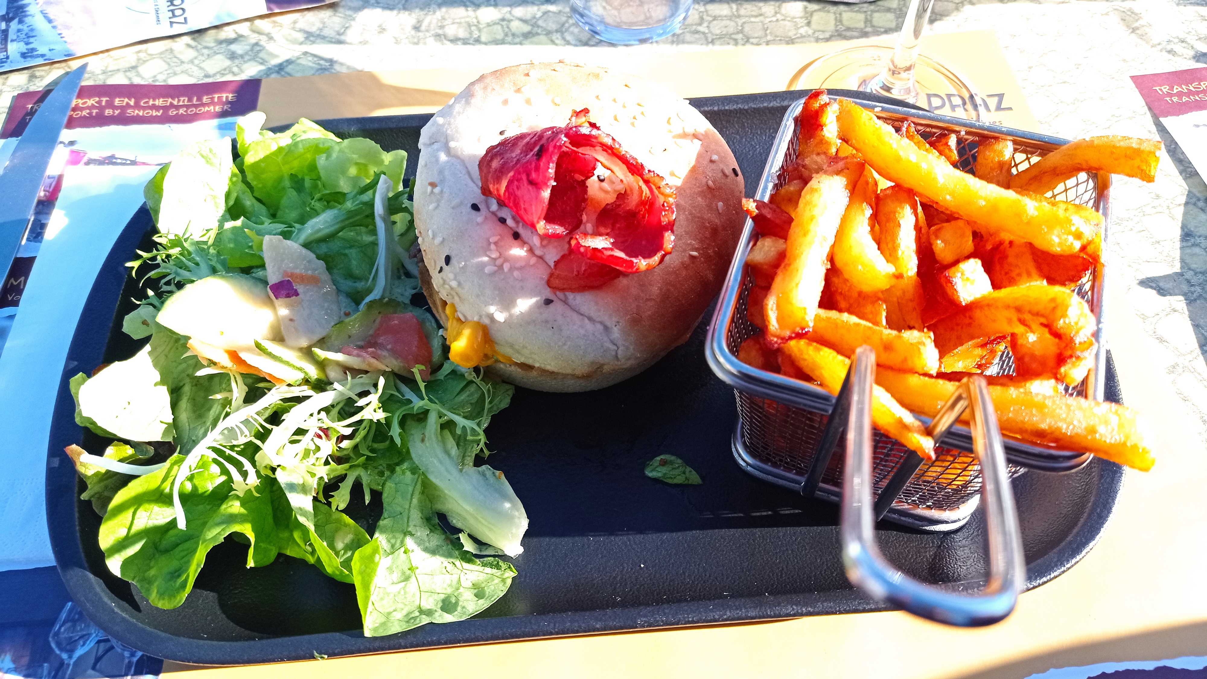 C'est un restaurant adossé à une colline en haut de la montagne, on y vient à pied. Il se situe sur le chemin de randonnée le dou du Praz. Hormis ceci nous y avons vraiment très bien mangé et à un prix très correct, cf photos du menus. Également en photos la boîte chaude et le burger savoyard. Mention spéciale aux frites qui sont top top top. Bref,un bon burger, un très bon restaurant et un bon service, que demander de mieux.