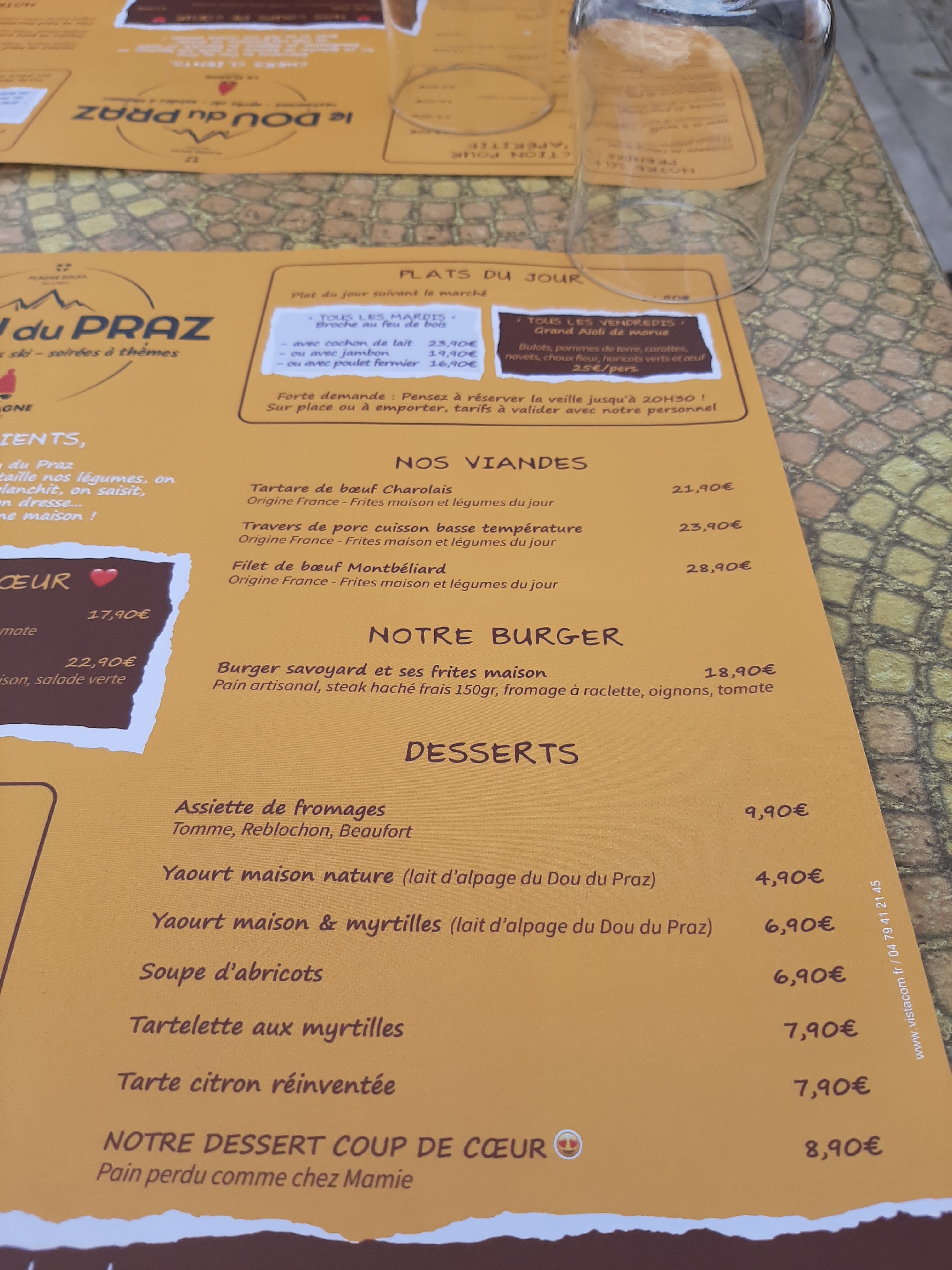 Tout est délicieux, et les serveurs sont très sympa! La vue est magnifique et le tour du dou du praz très agréable à faire! Pensez à réserver 😉