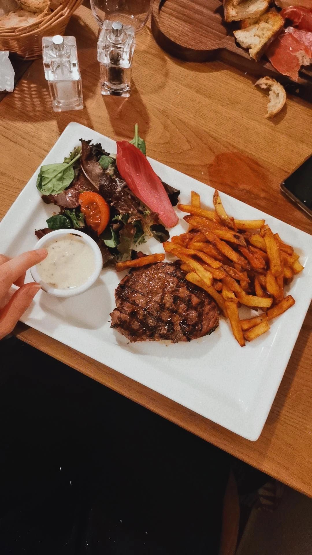 1ere fois dans ce restaurant le 13 avril dernier. J'ai adoré ! La décoration est sympa. Les 2 serveuses qui étaient là étaient professionnelles et très polies. J'ai pris un Pavé de rumsteak bien cuit 😍 (voir photo), et mes amies ont pris le Camembert rôti avec charcuterie, et le Coquelet rôti, elles ont beaucoup aimé leurs plats. Le dessert aussi était très bon (café/thé gourmand). Vraiment un sans faute 👌🏼 Une amie à moi a oublié de dire qu'elle était allergique au vinaigre, donc la salade avec la sauce vinaigrette impossible de la manger, et une serveuse lui a apporté une autre salade avec une autre sauce sans vinaigre, très gentille de sa part. 😊