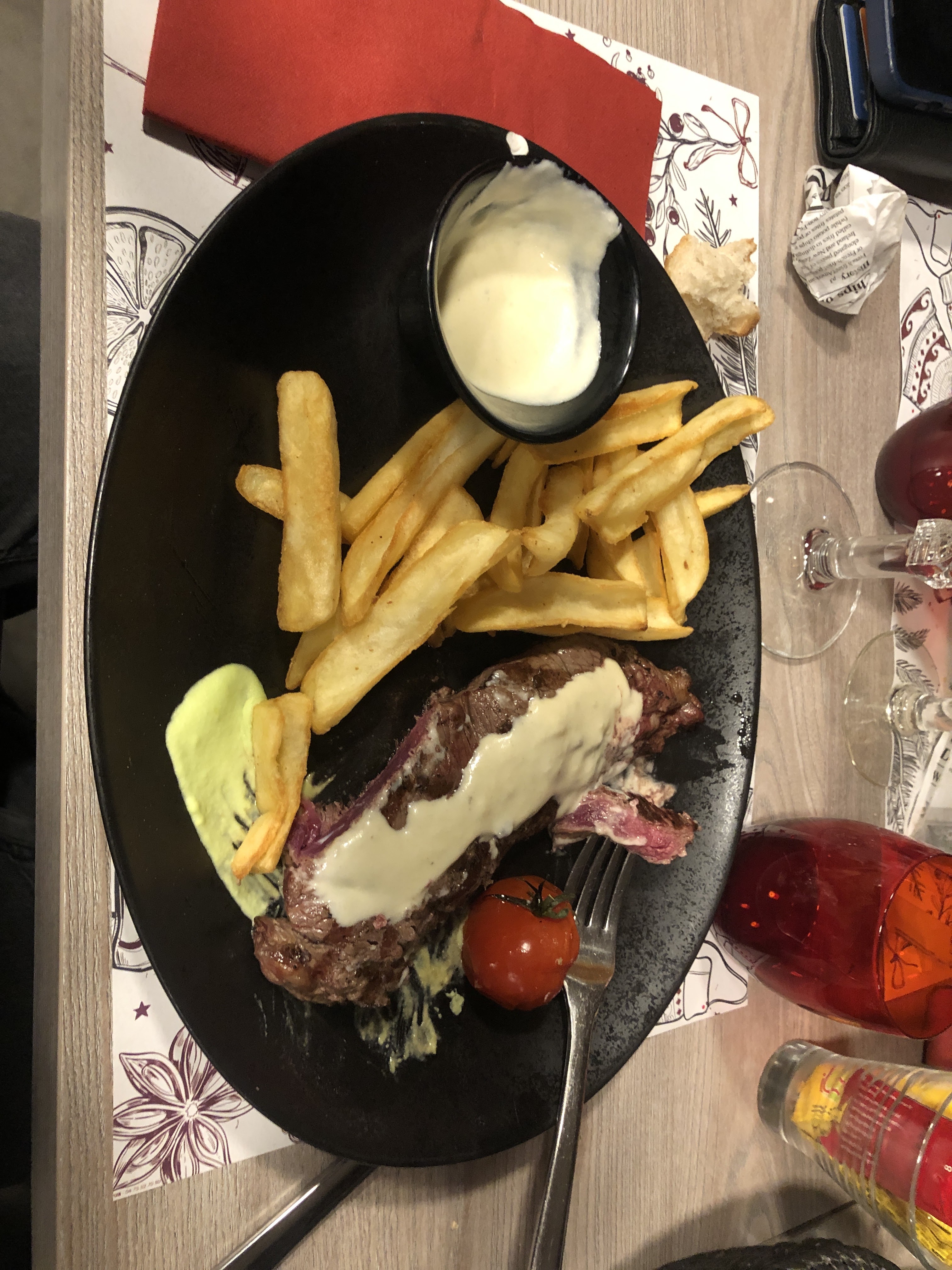 Repas très bon et cadre très sympa, penser à proposer les sauces avec les frites car si ont ne sais pas qu'il en a de disponible ont ne peux pas en demander hormis ça c’était top!