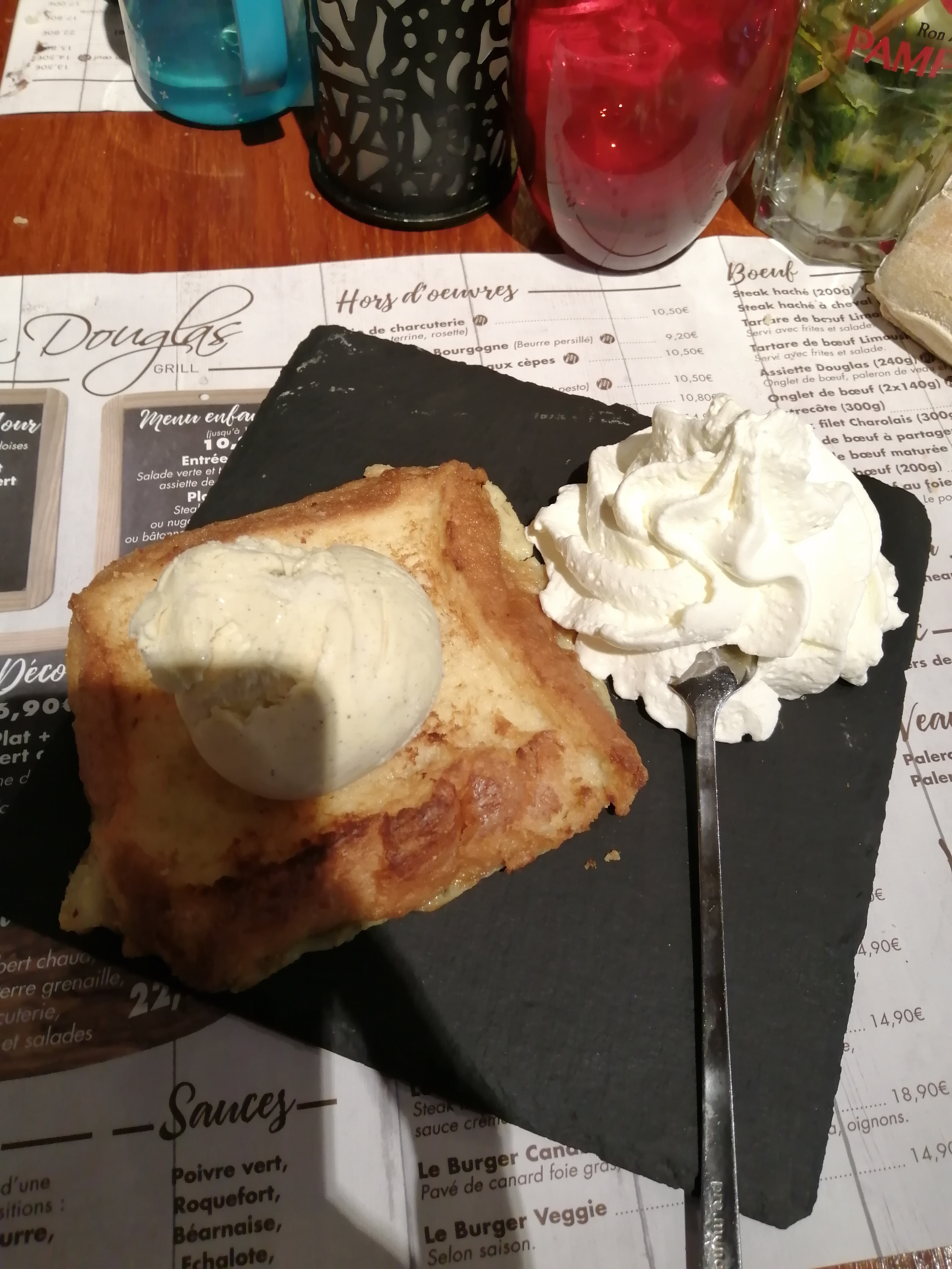Très déçu de ce restaurant nous avons commandé un plat principal mont-dore et franchement je me demande où ils l'ont trouvé car j'ai cherché le fromage et ben figurez-vous qu'il y en avait pas on avait l'impression que c'était un reste d'une table où il y avait rajouté. Je ne sais quoi dedans mais pas de fromage nous avons pris un dessert avec ma compagne. C'était du pain perdu mais il était vraiment perdu pas terrible non plus quand c'est pas bon, faut pas hésiter de le dire. Je suis deg et de plus ça m'a coûté 85 €