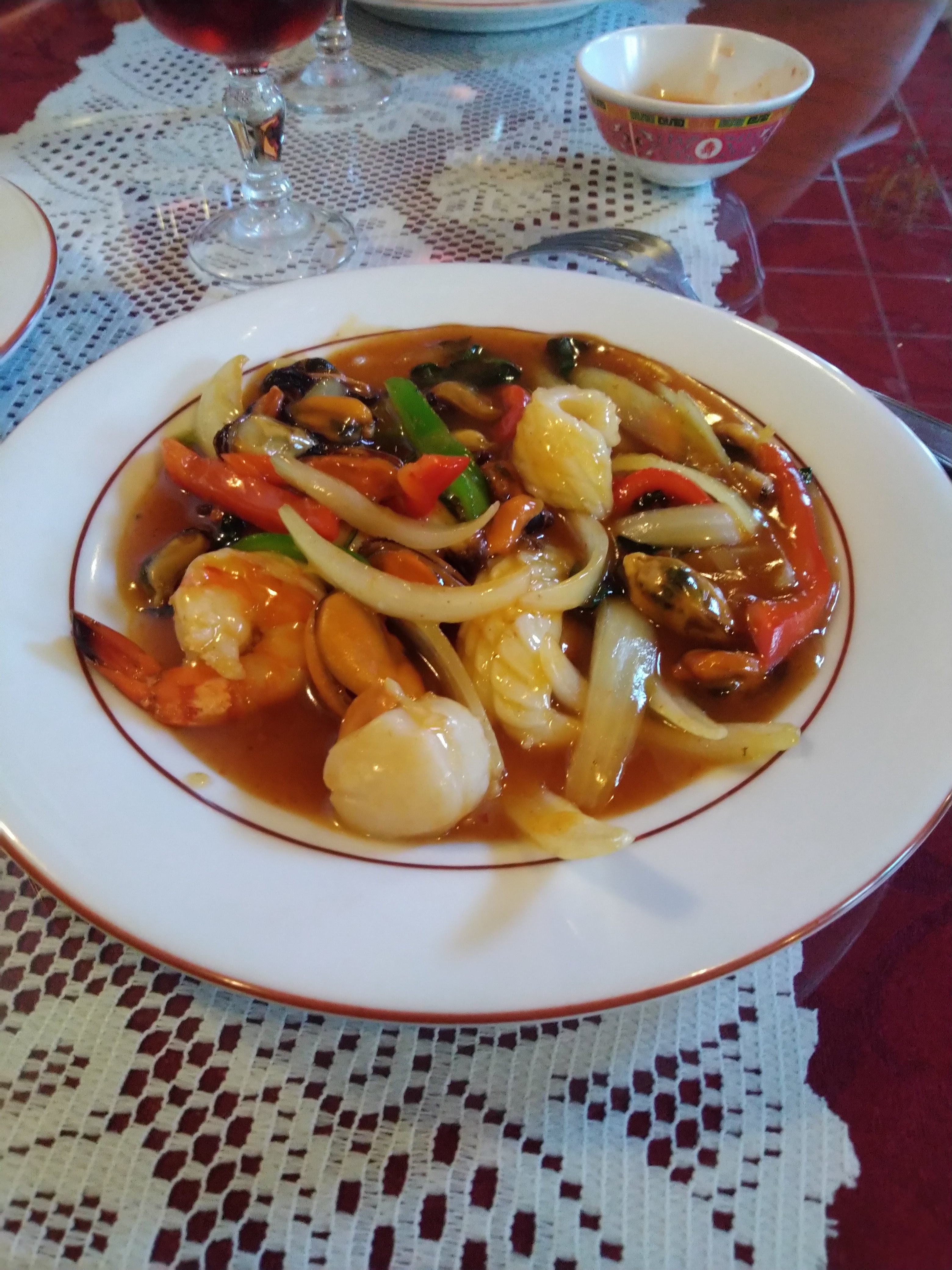 Salade thaï crevette et spécialité thaï fruits de mer très bon . Accueil et service excellent ,merci !