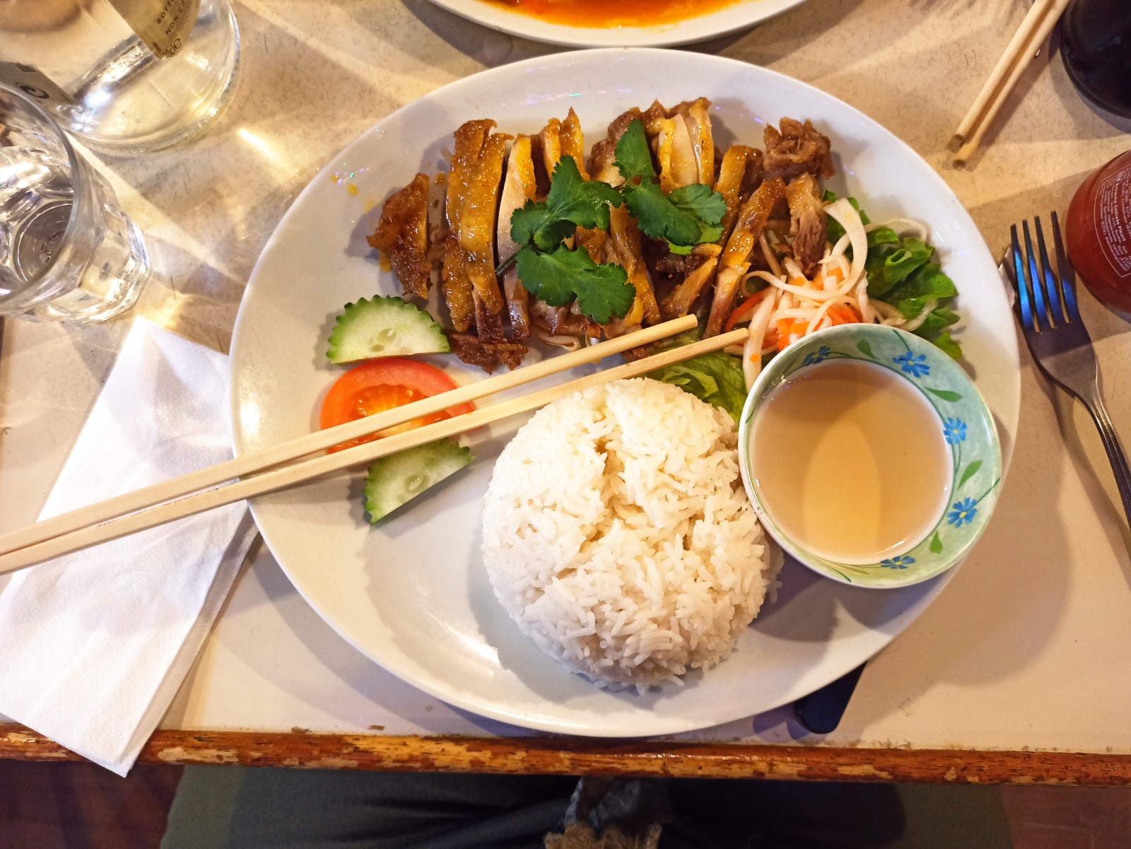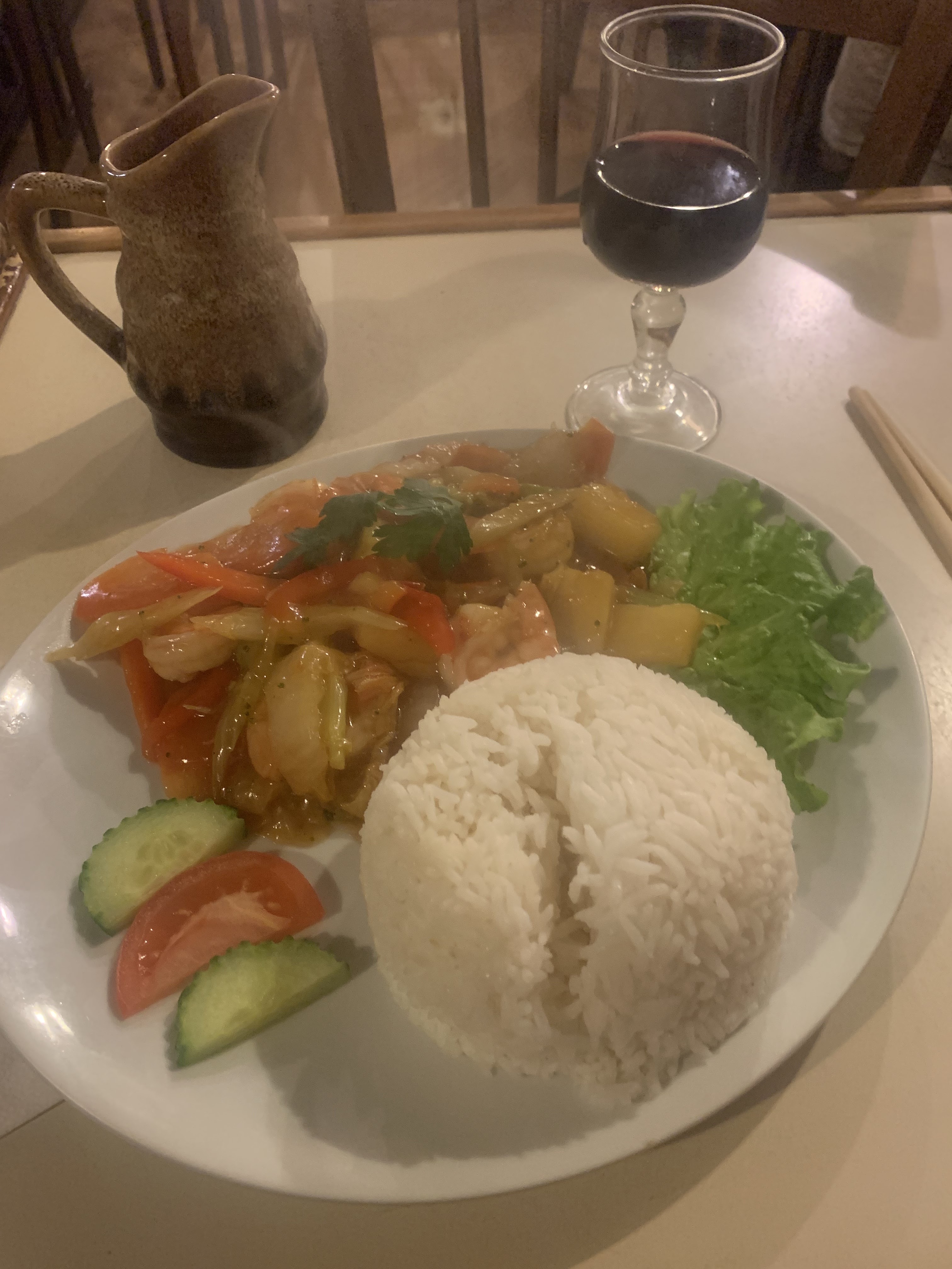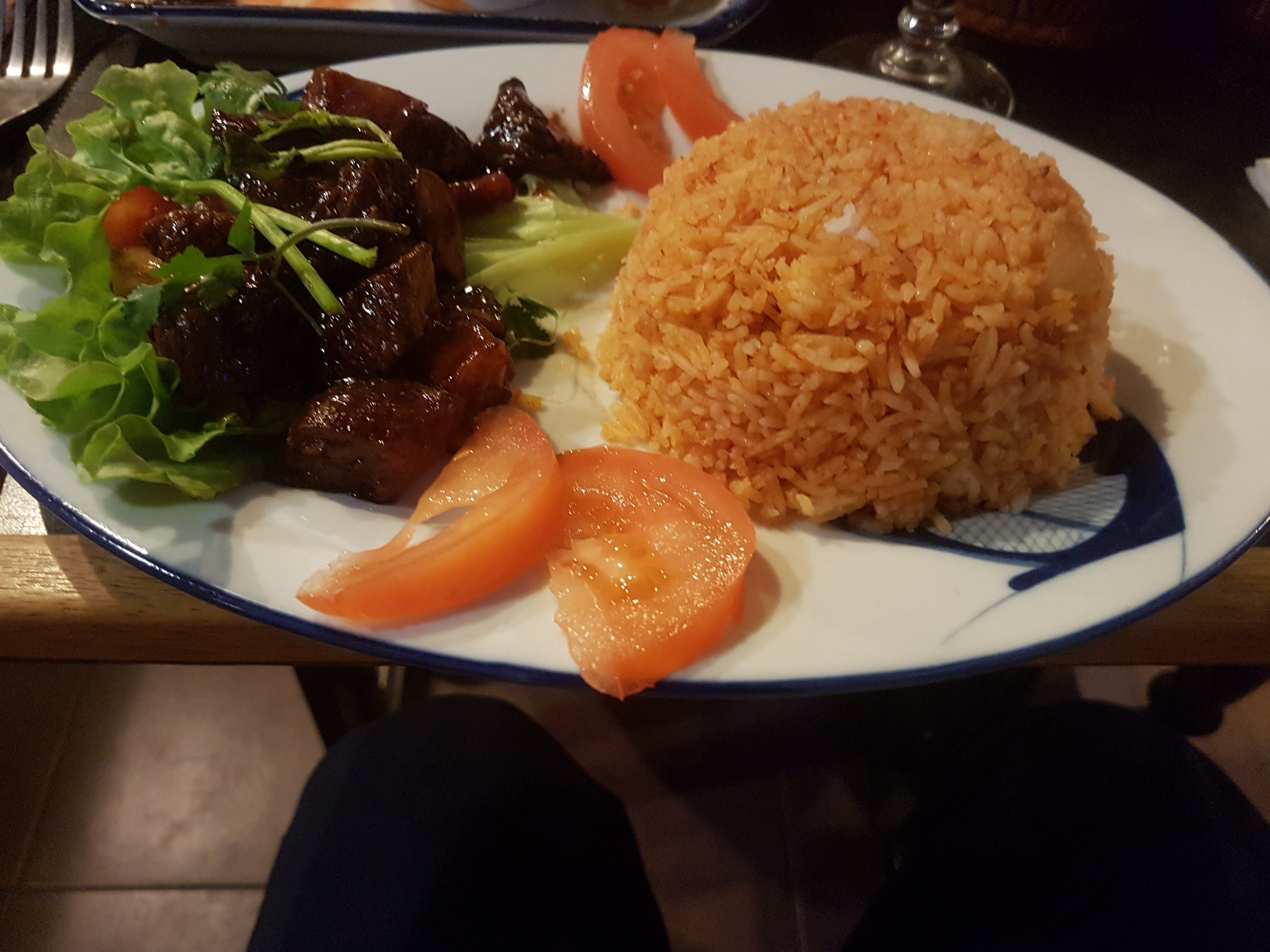 Un lieu atypique et une nourriture Absolument délicieuse… Nous avons pris poulet au curry, avec des nems au porc en entrée qui étaient très goûteux. Riz cantonais très bon également. Nous y retournerons pour goûter le bœuf loc lac car ça semblait délicieux dans l’assiette de nos voisins. Attention, ils ne prennent pas la carte bleue donc penser à retirer des espèces avant d’aller. À tester, car vraiment très bon, une très belle découverte