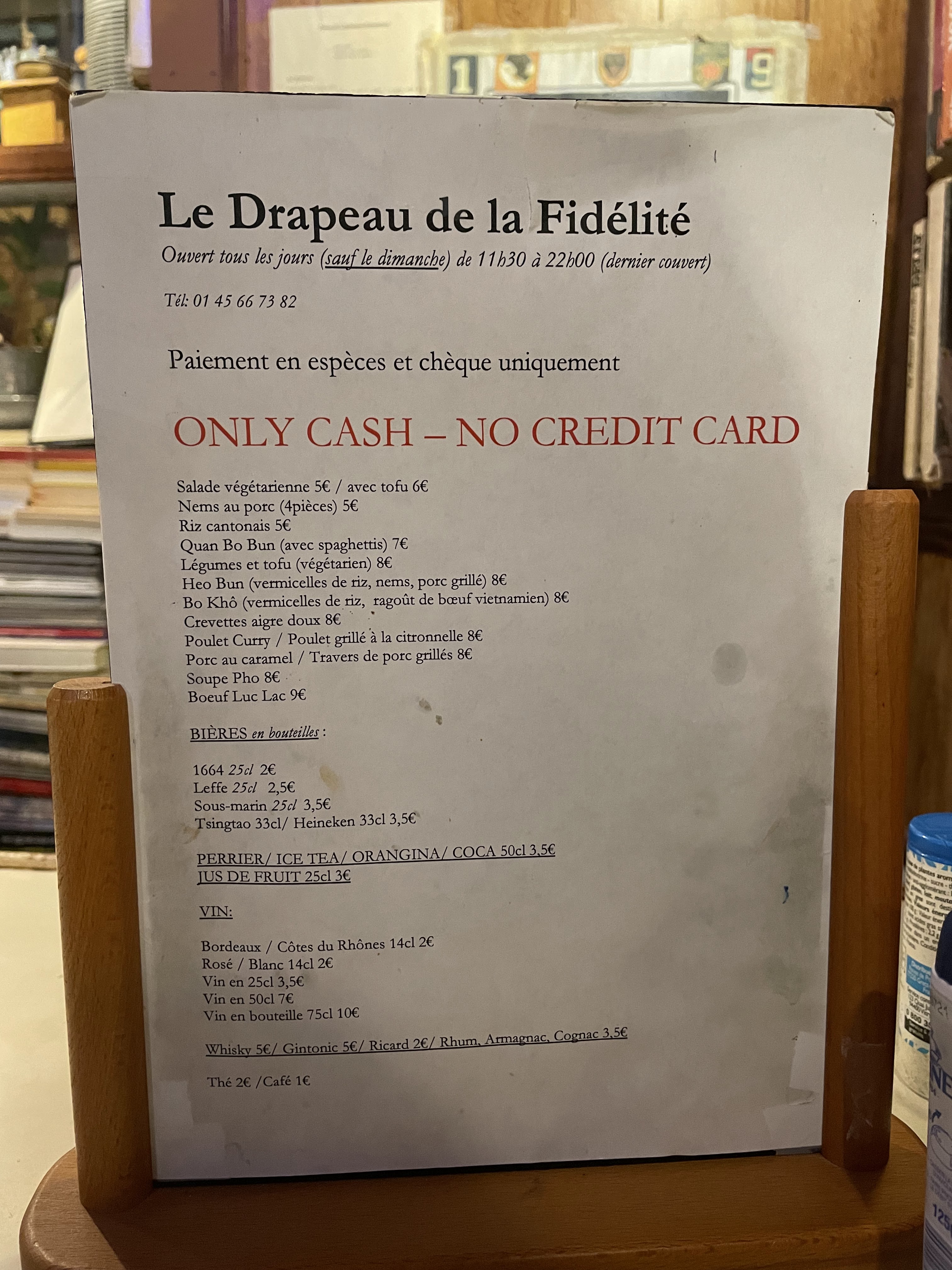 Pas cher, choix limité car tout est fait par le chef et c'est très bon! On aime l'ambiance conviviale où on mange entourés de livres, de monde, de jeux... Et surtout le service est surement le plus sympathique de tout Paris :)