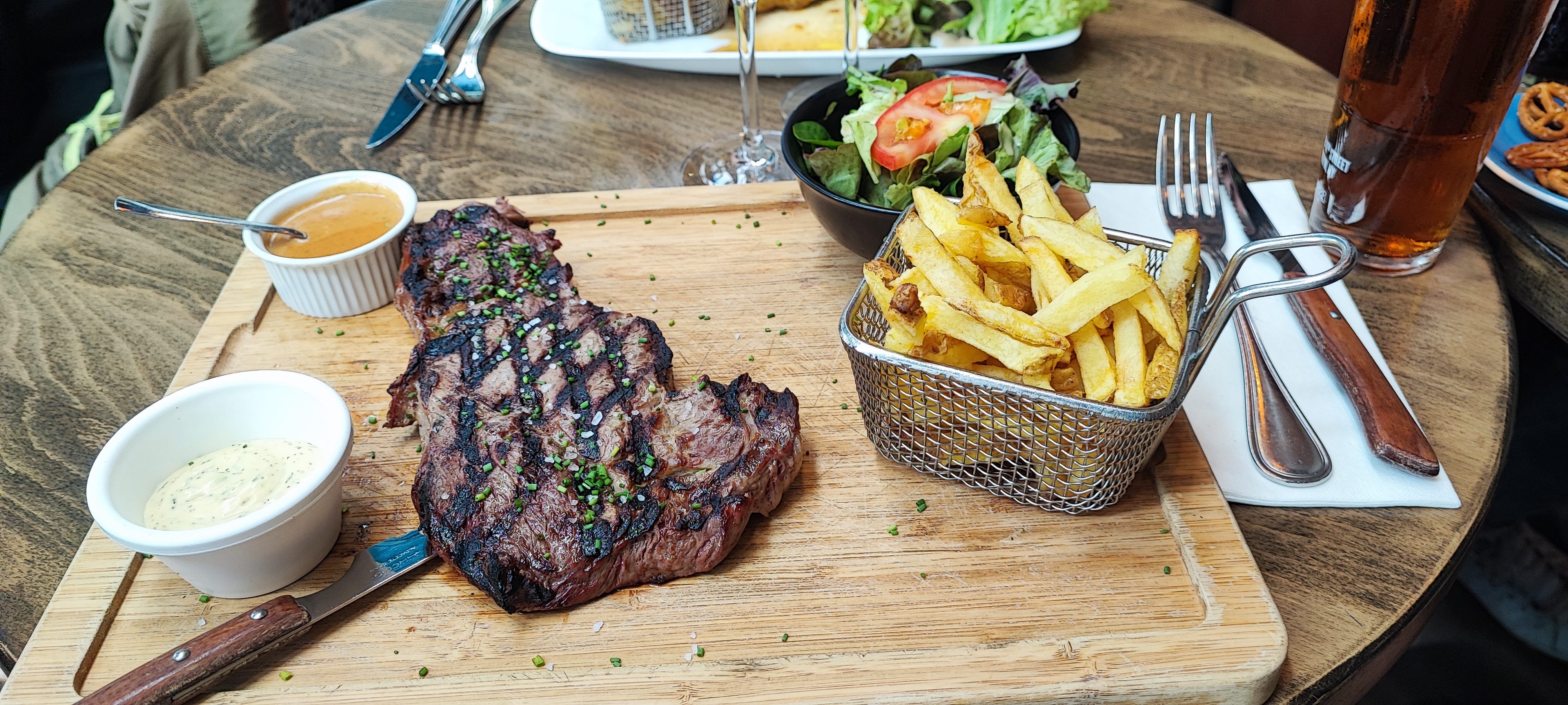 Le lieu est beau , on attend longtemps les serveurs . En ce qui concerne la nourriture, la bavette était passable, il fallait de bonnes dents en revanche l entrecôte, était loin d être tendre, trop de nerf,même le couteau était fatigué, j en ai fait la remarque à un serveur qui a envoyé un second serveur et pour toute réponse j ai eu droit ça peut arriver que ce soit dur! Il était désolé et malgré ma demande aucun geste commercial , donc ni dessert , ni café on leur a déjà laissé trop d argent pour de la si mauvaise qualité ! Méfiez vous